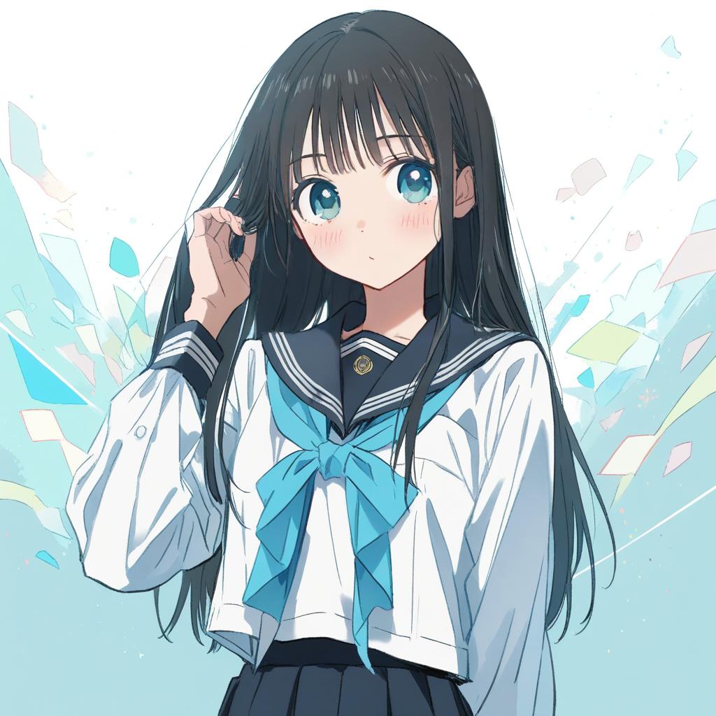 Illustration of an anime-style girl with long black hair and blue eyes wearing a traditional Japanese serafuku school uniform. The uniform consists of a white long-sleeve shirt with a black sailor collar and a blue ribbon, paired with a pleated skirt. The background features a soft pastel geometric pattern.