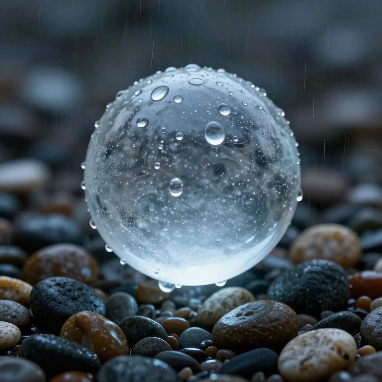 A luminous, translucent sphere brimming with suspended raindrops hovers serenely amidst a bed of scattered pebbles, defying gravity in a dreamlike, otherworldly scene.