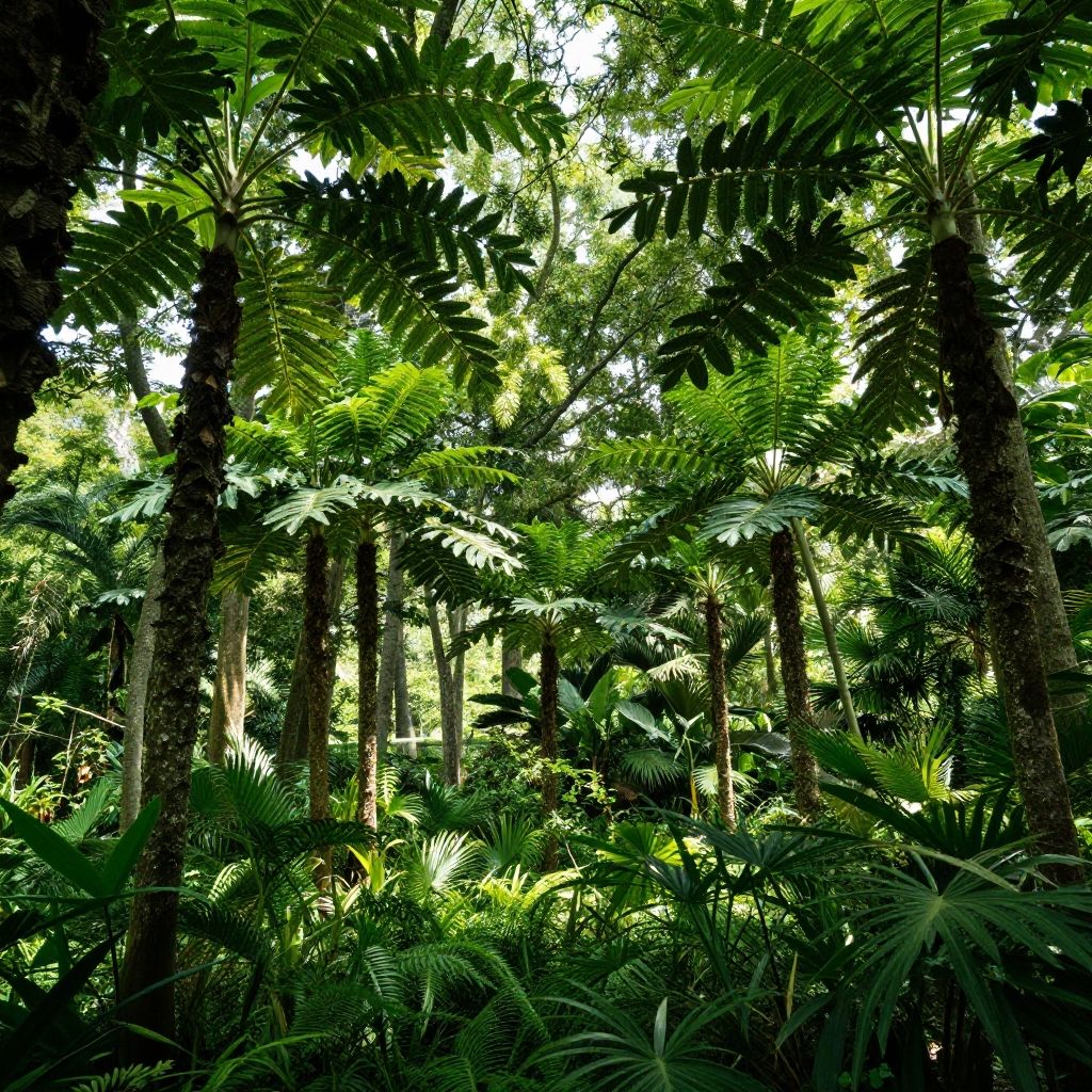 Wide-angle view of towering breadfruit trees with large green leaves in a lush tropical garden. Sunlight filters through the canopy, highlighting the dense foliage and tranquil atmosphere of the secret garden oasis.