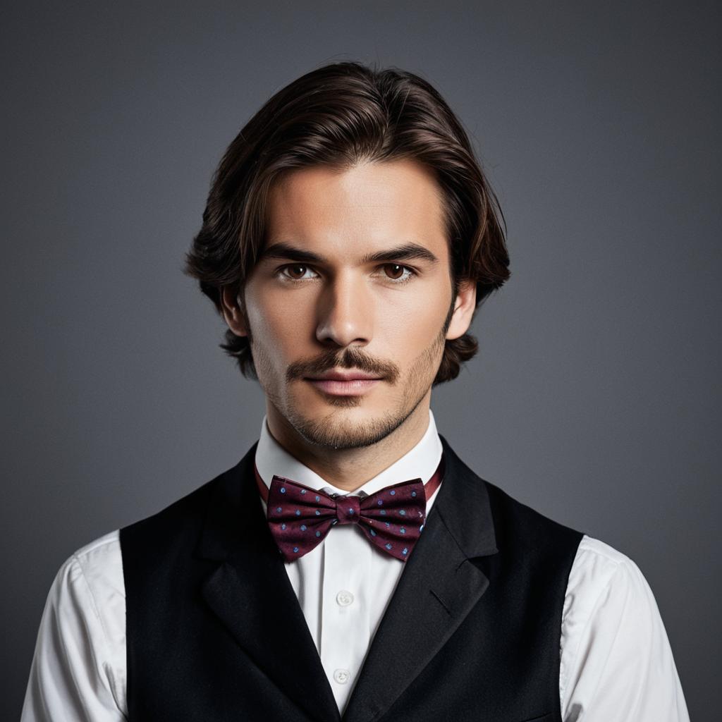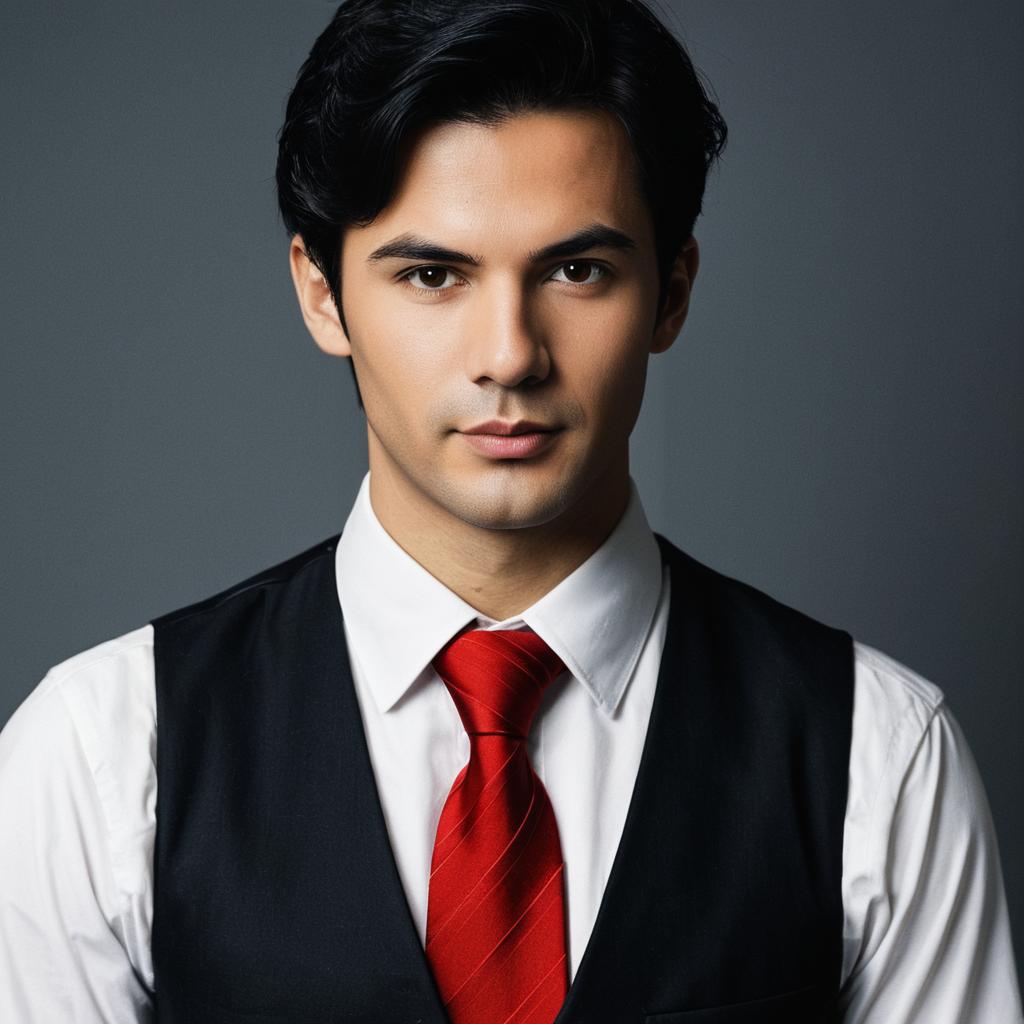 Portrait of a young man with black hair and neatly groomed facial hair wearing a white shirt, vibrant blue bowtie, and a red vest. He is looking directly at the camera with a confident expression, set against a plain light background.