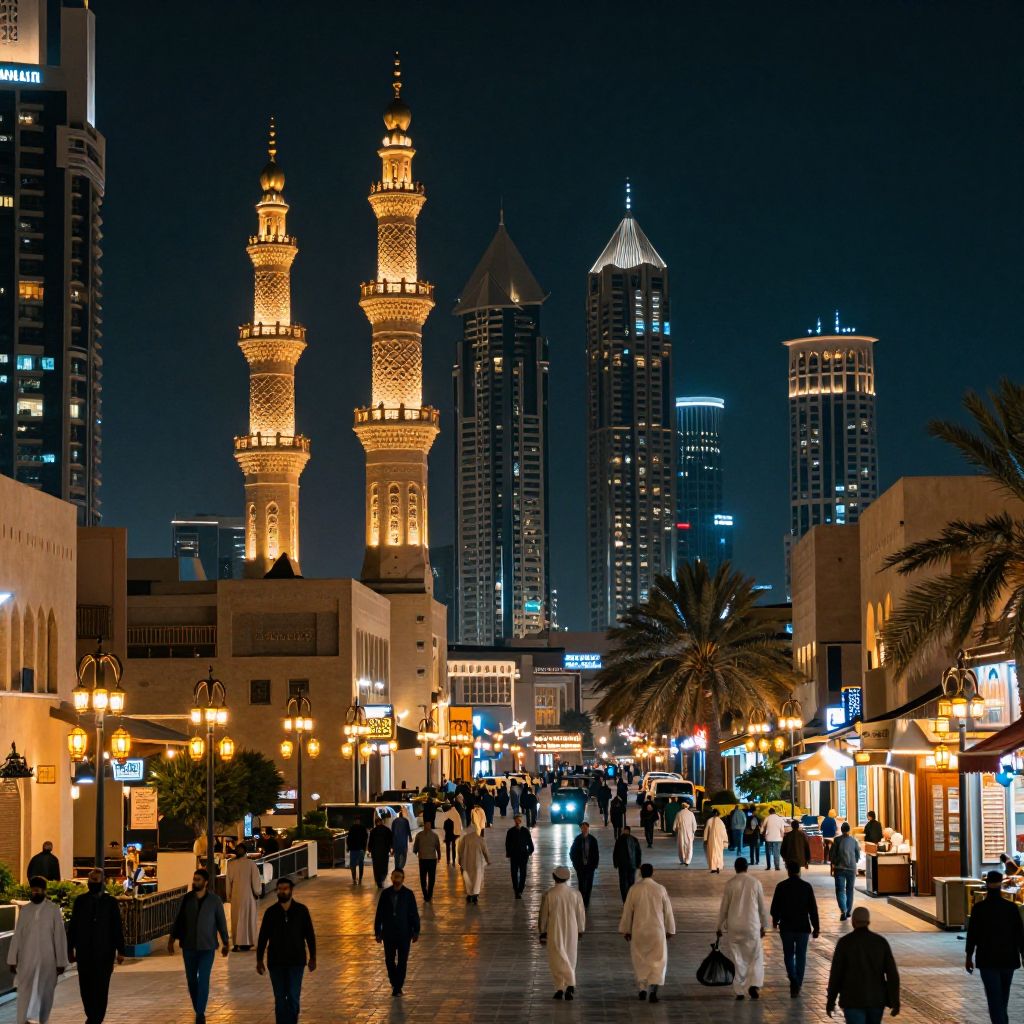 Photograph of a nighttime urban scene in a Middle Eastern city, featuring illuminated minarets, modern skyscrapers, and people in traditional white robes