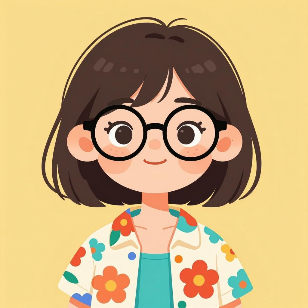 Illustration of a cartoon caricature of a young woman with short dark brown hair, large round black glasses, flushed cheeks, and freckles. She is wearing a colorful floral shirt with red, blue, and yellow flower patterns over a turquoise top. The background is bright yellow, giving a playful and vibrant style.