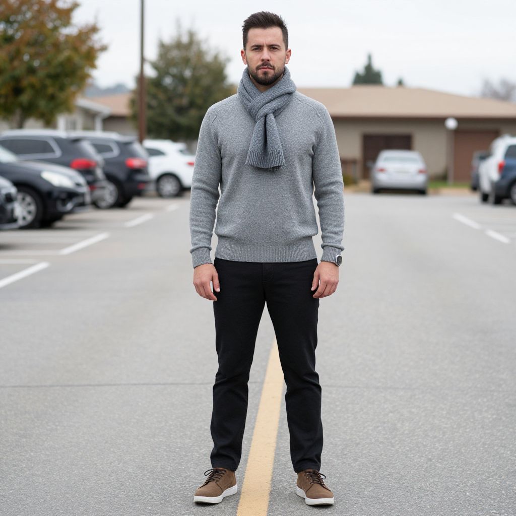 Smart Casual Man Winter Costume, man in a gray sweater and scarf standing in a parking lot