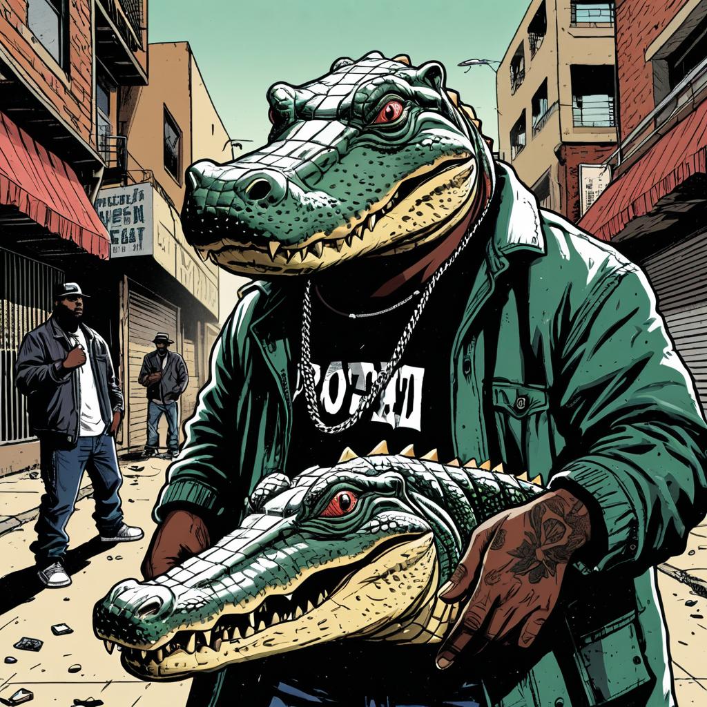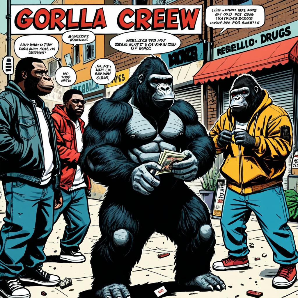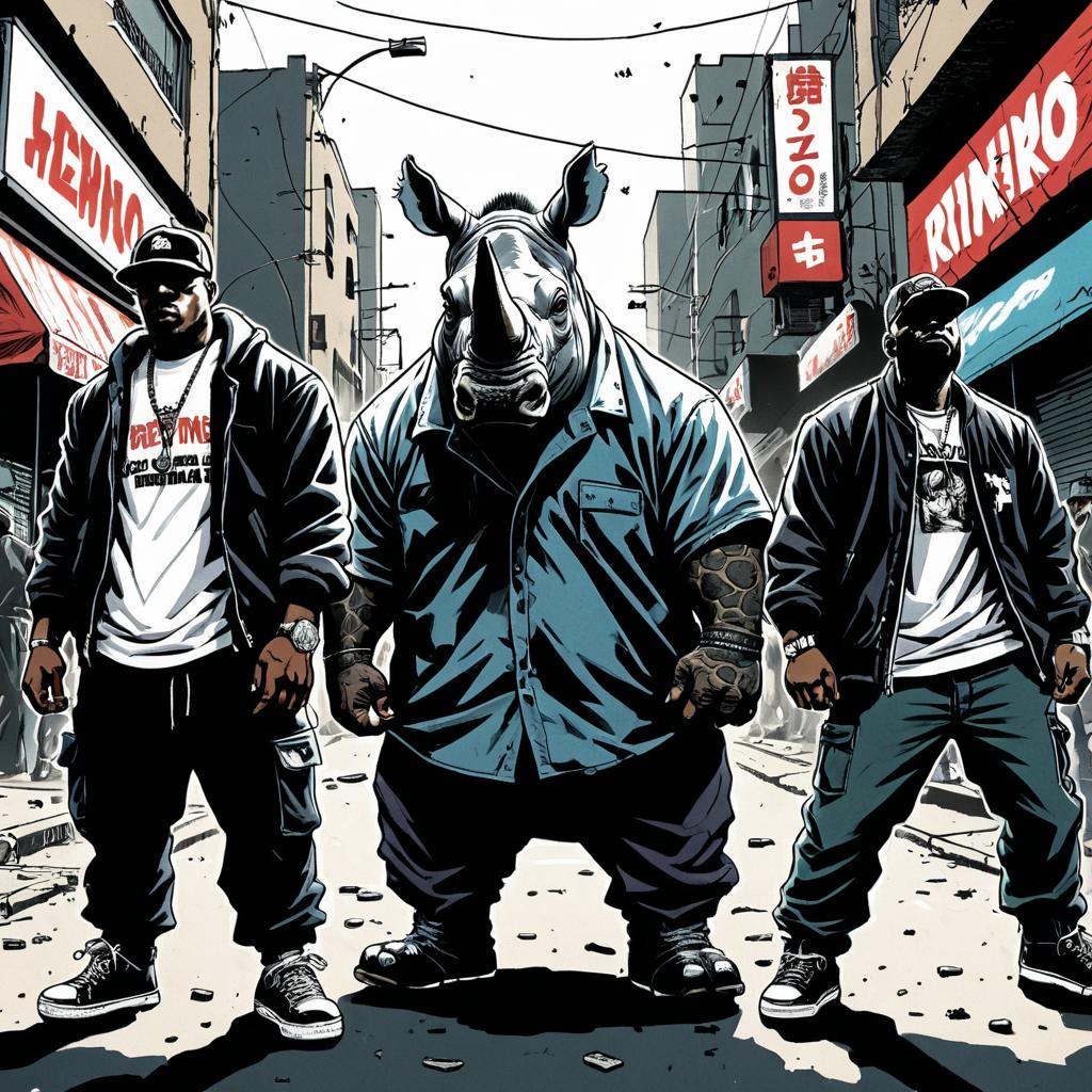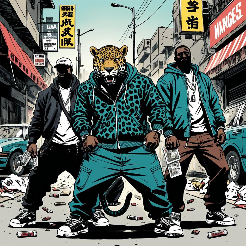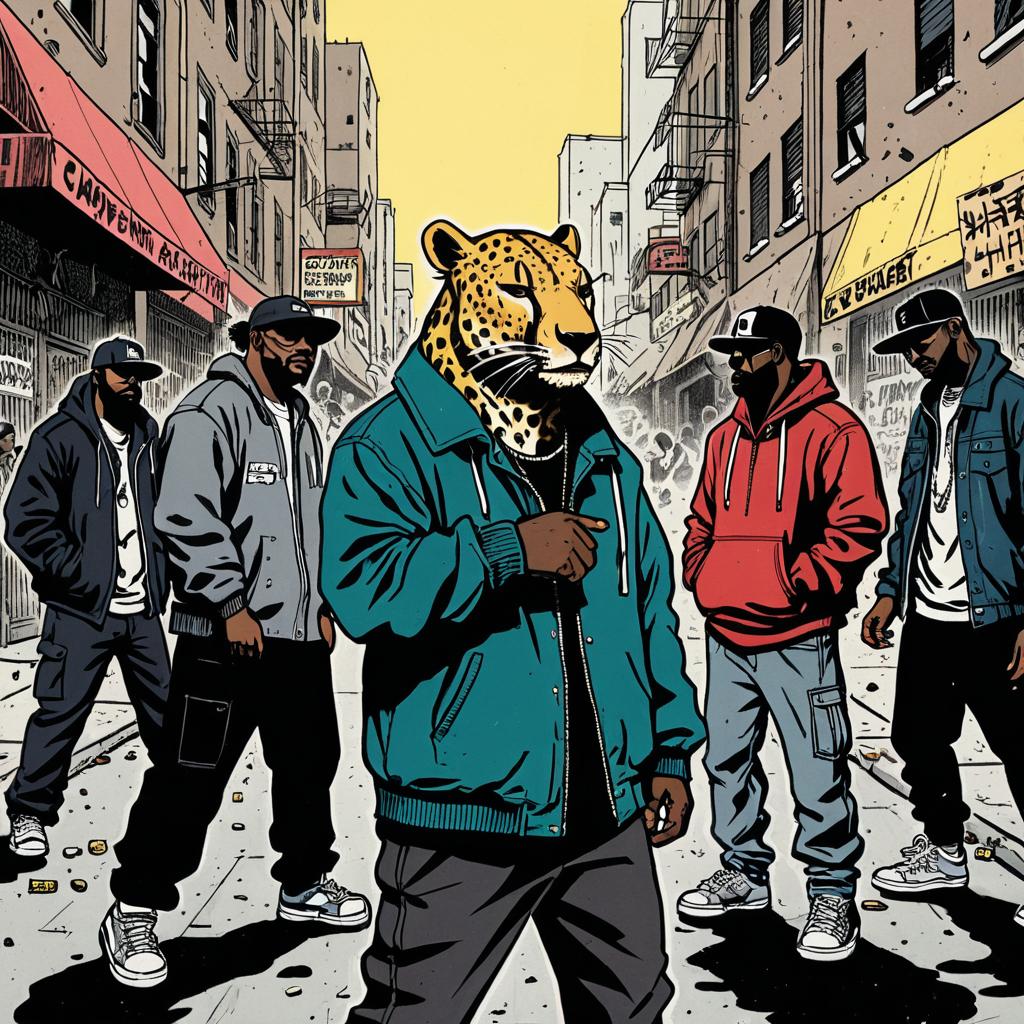Action Painting single panel comic telling a dramatic story about shady cheetah syndicate selling drugs and fighting in the streets, lo-fi, gangsta hypebeast faceless hippos, ghetto, lo-fi, album cover, ultra-detailed,
