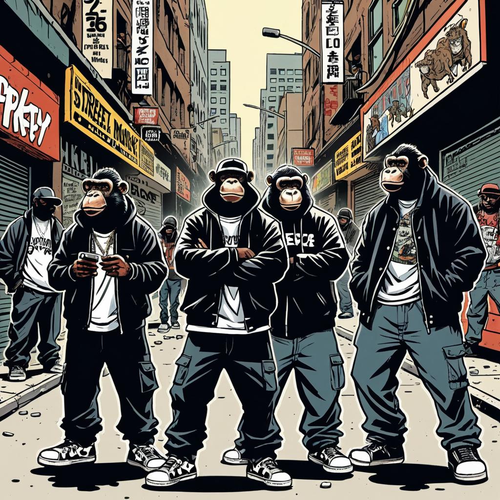 Illustration of a group of five men standing in an urban street setting. The central figure has a cheetah head and wears a teal jacket with black pants. The surrounding men wear casual streetwear, including hoodies, jackets, and caps, all with their faces partially obscured or shadowed. The background is a detailed city street with buildings and graffiti, evoking a gritty urban atmosphere, typical of lo-fi hip-hop and gangsta themes.