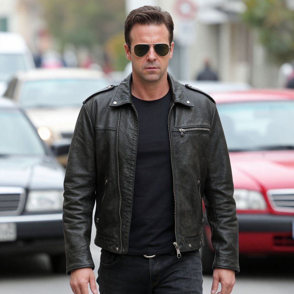 Grease Movie Character Costume, man in leather jacket standing on street with cars in background