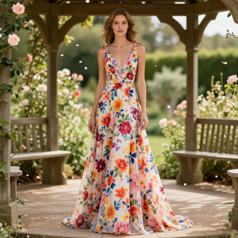 A stylish bride-to-be with warm golden-brown hair and natural freckles stands in a rustic garden pavilion, wearing a vibrant floral engagement dress with layered petal-style prints and a flowing train, the dress catching natural light as petals drift gently from a nearby rose trellis in soft-focus background