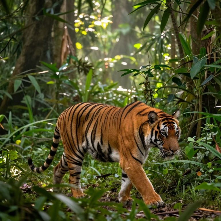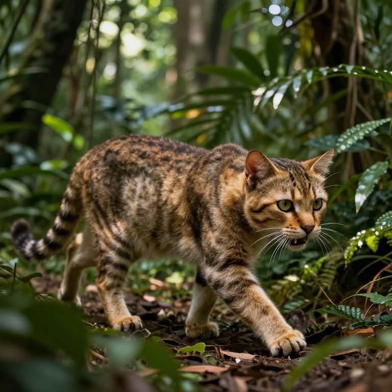 Photograph of a tabby cat with a brown and black striped coat, yellow-green eyes, and a white underbelly, walking cautiously through a dense, sunlit forest. The cat's front right paw is mid-step, and its ears are alert. The background is filled with lush green foliage, including large leaves and ferns, with dappled sunlight filtering through the trees. The forest floor is covered in brown leaves and dirt. The cat's fur is short and sleek, and its expression is focused and intent. The image has a high-contrast, vibrant style.