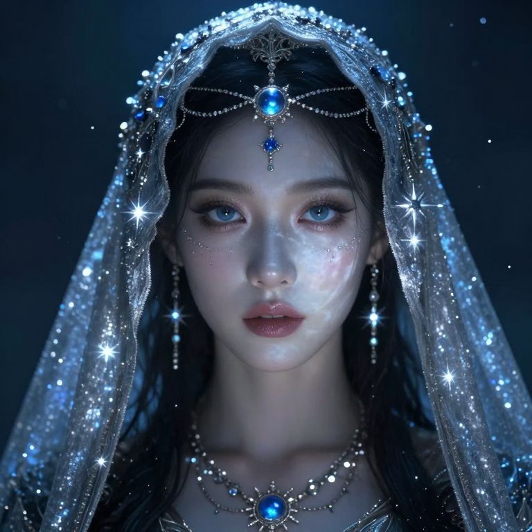 This digital art portrait features a strikingly beautiful woman with fair skin and piercing blue eyes, wearing an intricate, glittering veil adorned with star-like sparkles and blue gemstones. Her dark brown hair peeks from under the veil. She has a delicate necklace and matching earrings, both with central blue gemstones, and a similar gemstone is set in her forehead. Her lips are slightly parted, and her expression is serene yet intense. The background is a dark, gradient blue, enhancing the ethereal, magical quality of the image. The overall style is hyper-realistic with a fantasy theme.