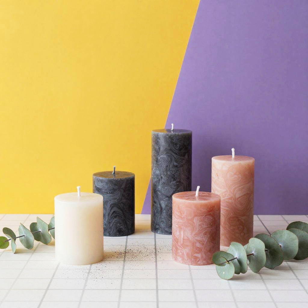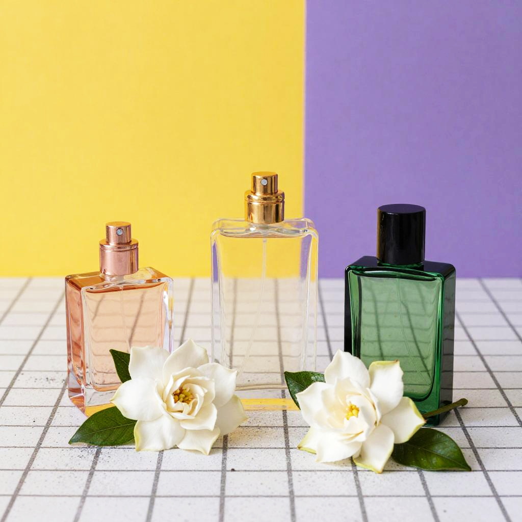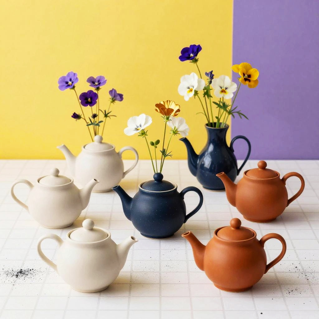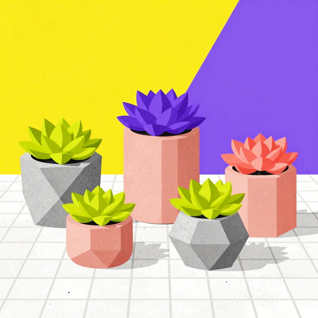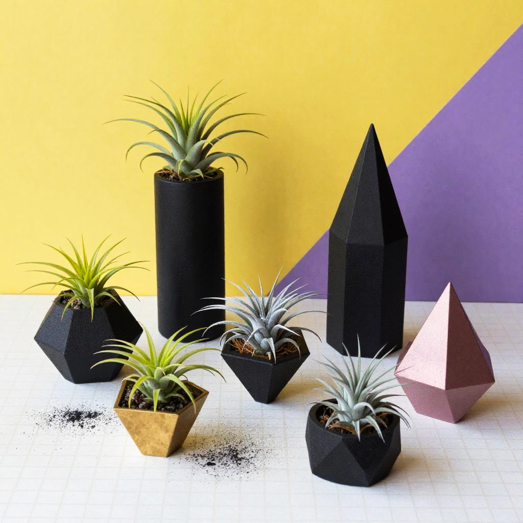 A vibrant dynamic arrangement of geometric terrariums and air plants arranged on a white grid-patterned floor dusted with black speckles, with bold yellow and purple geometric shapes in the background. Emphasize matte black, brass, and aquamarine terrariums; air plants in lime green, silver, and dusty rose. Keep the tone upbeat and modern: clean silhouettes, balanced layout, crisp edges, subtle texture. Render with high detail, balanced layout, crisp edges, high detail.