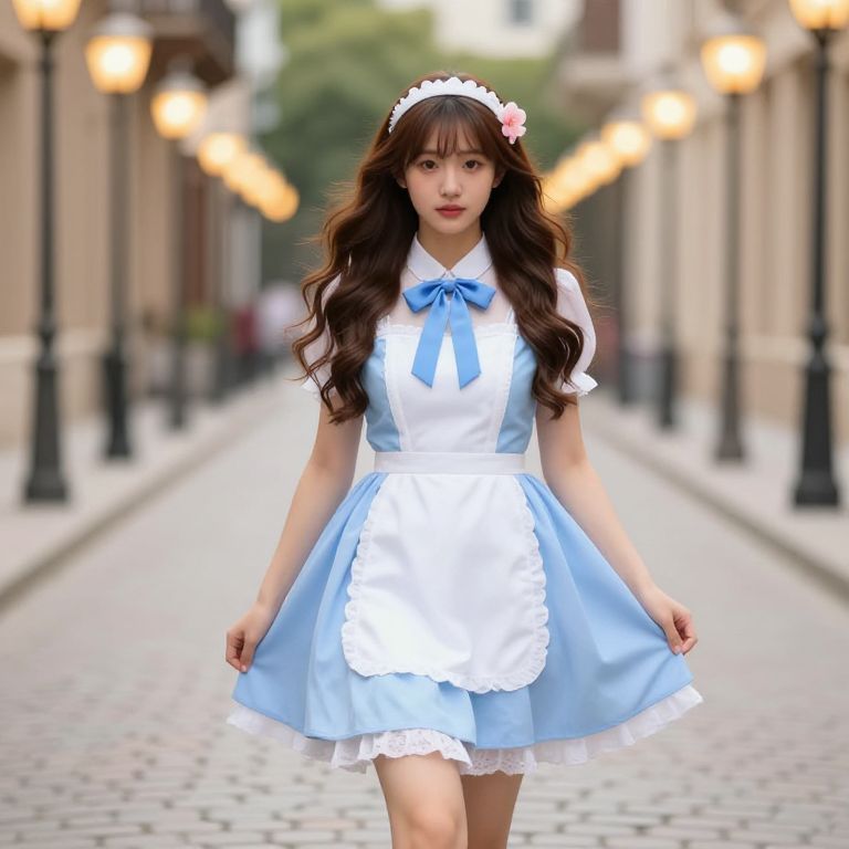 Girl with long brown hair, wearing a blue and white dress with a blue ribbon around the neck, and a white headband with a pink flower on it. She is walking on a cobblestone street with a row of lamps on either side of her.