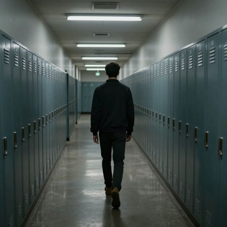 Ostracized character walking down an empty hallway with lockers, cold fluorescent lighting, muted grays and blues, symbolic imagery of loneliness in institutional settings, dramatic shadows and perspective