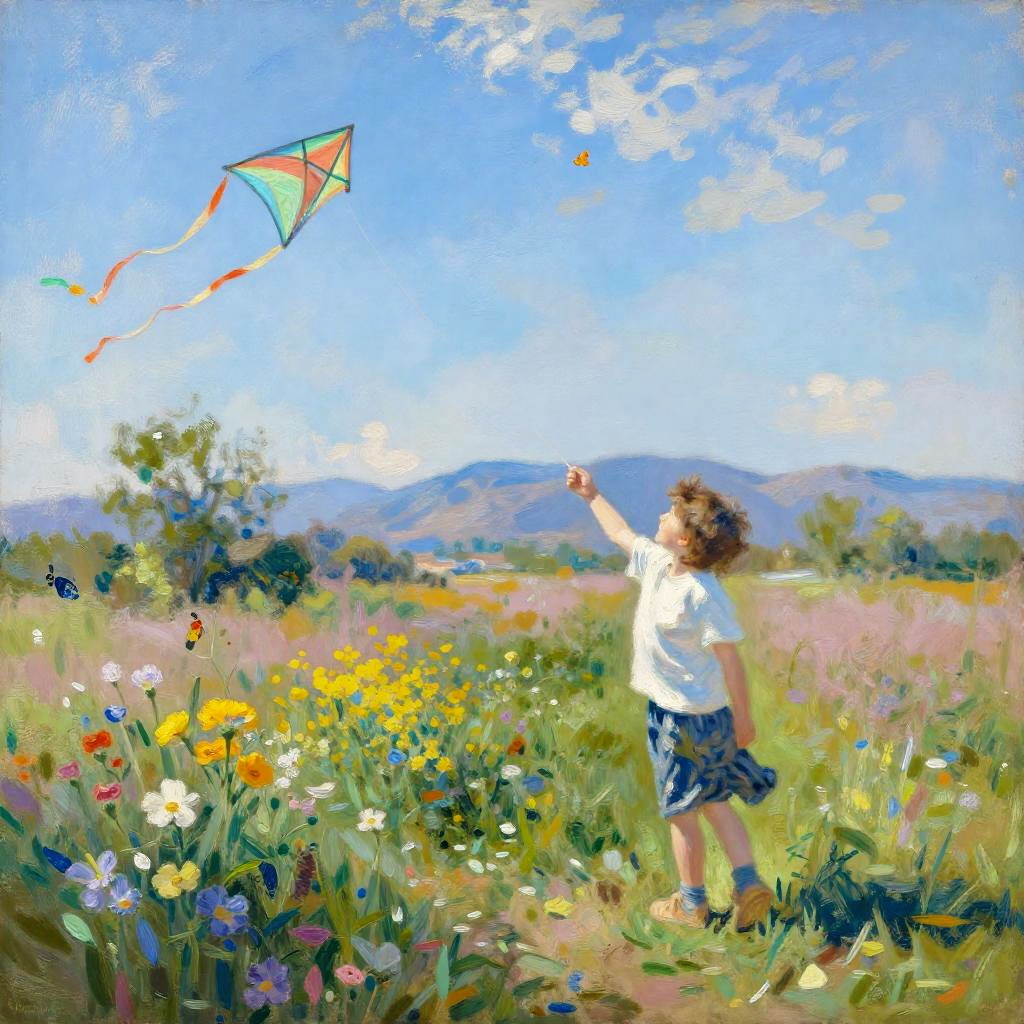 Realistic photo.Impressionist painting of a child with a kite, playing in a meadow of wildflowers, enjoying a breezy day under a clear blue sky, with soft brush strokes, vibrant colors, impressionist masters, with blooming flowers, butterflies, and distant mountains. realistic photo