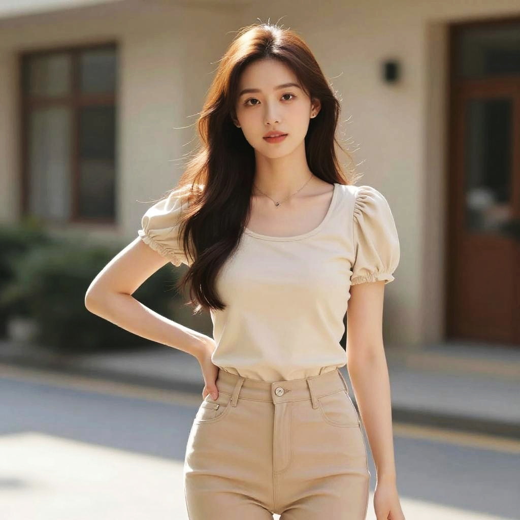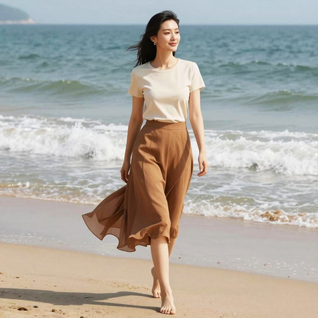 A fashionable woman walks gracefully along a serene beach, showcasing her flowing skirt and casual top. The gentle ocean waves create a picturesque backdrop, highlighting her confident and carefree spirit.