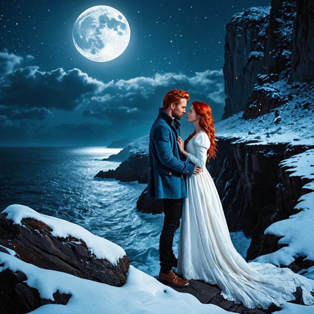 A tall man with fiery red hair wearing a fitted azure jacket stands close to a young woman with long red hair in a flowing white gown. They are on a snowy seaside cliff under a full moon, with the ocean and rocky shore visible in the background. Snow is gently falling, creating a mystical nighttime atmosphere.