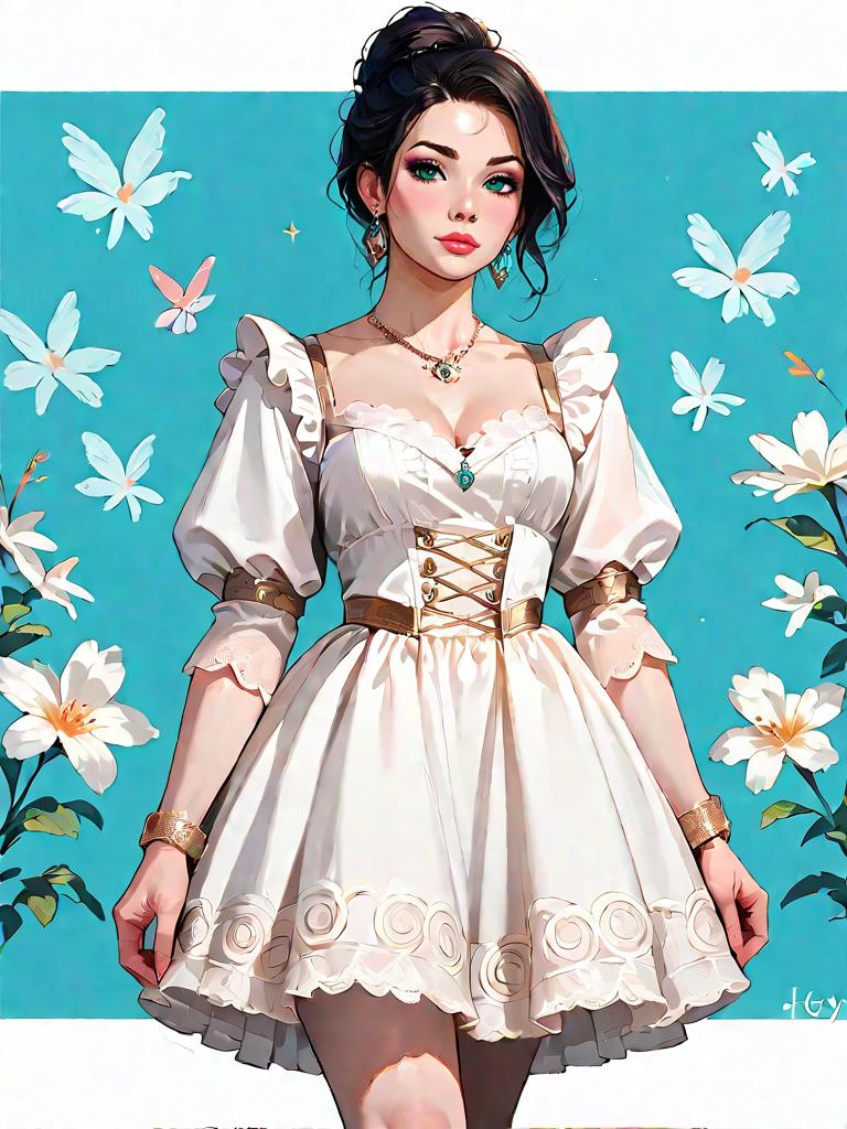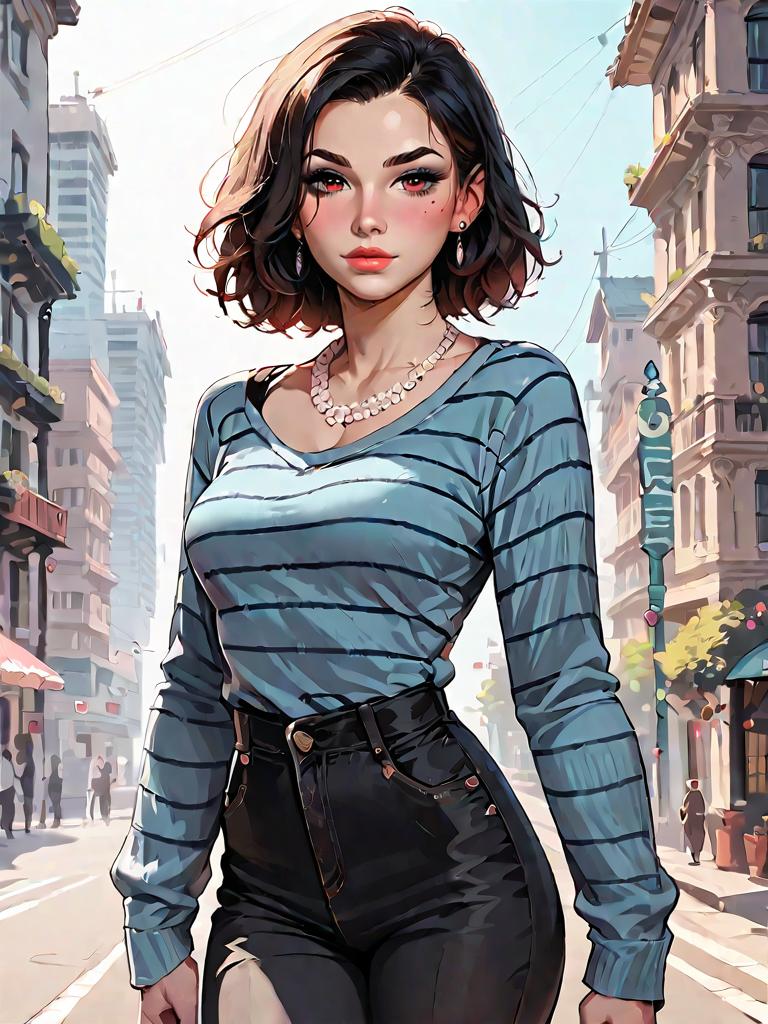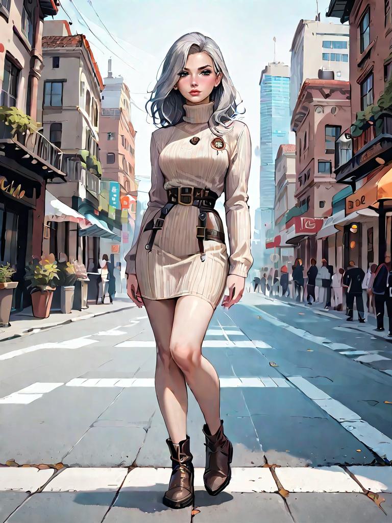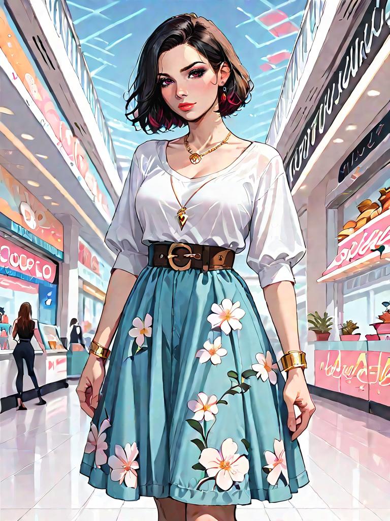 1girl, source_comics, realistic face, full body shot, Woman, casual chic, plum-colored scoop neck long-sleeve top, floral printed mini circle skirt in autumn hues, thin brown belt, gold charm necklace, stacked gold bracelets, cocktail ring, handheld brown leather clutch, outdoor shopping mall background