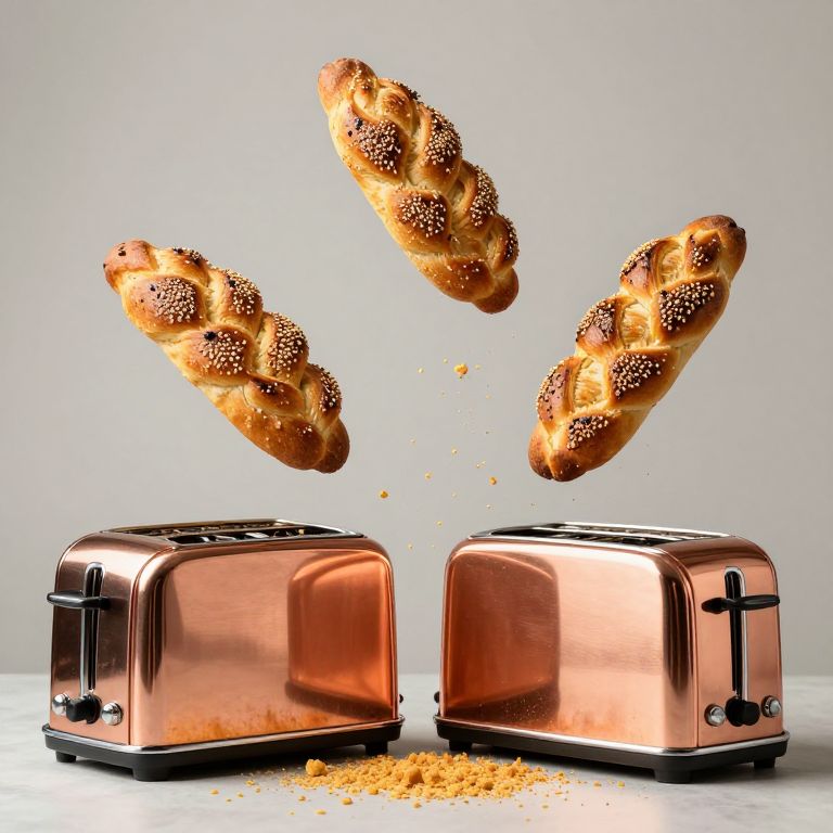Golden crumbs cascade from three levitating baguettes, each intricately braided and dusted with sesame seeds, hovering above matching copper toasters that rest on a bed of scattered crumbs against a neutral backdrop.