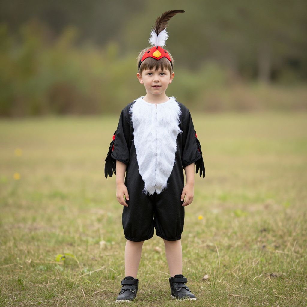 Photograph of a young boy in a black and white bird costume with a red headband and feather, standing on grassy field.
