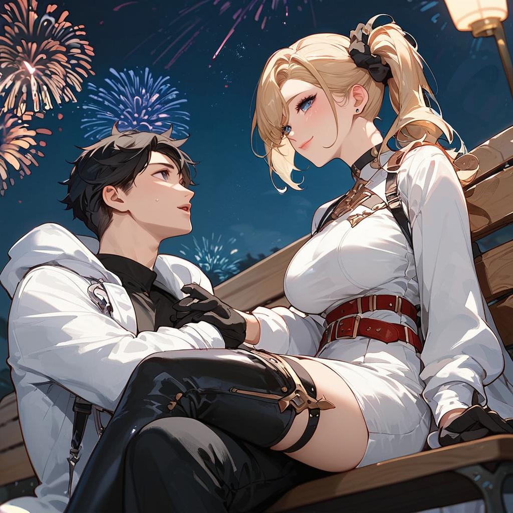 Score_9, score_8_up, score_7_up, score_6_up, source_anime, man and woman sitting next to each other, looking up, night sky, fireworks, stargazing, bench, night 1boy, black hair, white coat, black shirt, black gloves, thigh strap, red belt, black pants, sitting, happy, blonde hair, side ponytail, scrunchie, choker, white jacket, white dress, thigh boots, large breasts
