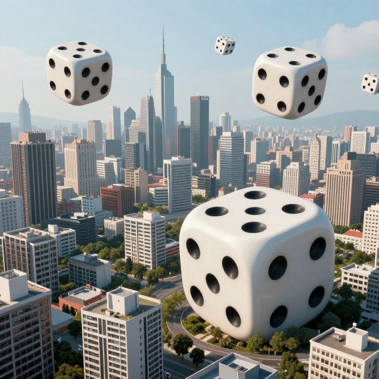 Digital artwork: Giant white dice with black dots hover above a bustling modern cityscape, featuring skyscrapers and greenery. Clear blue sky in the