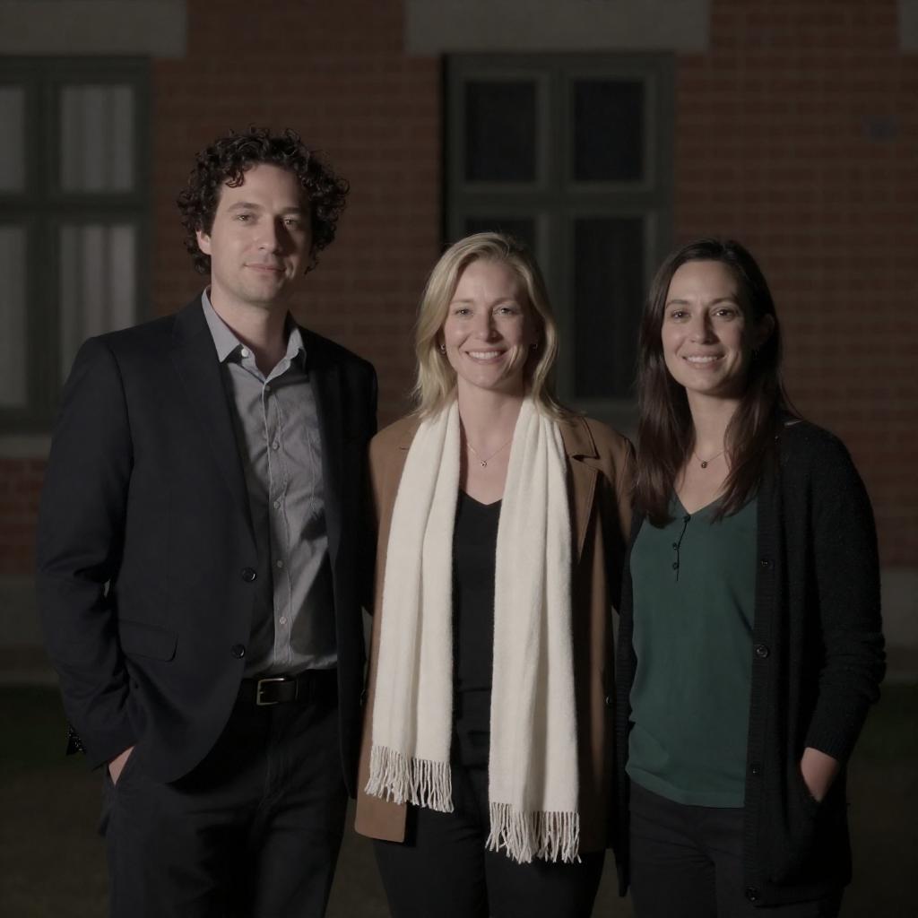 Photograph of three people standing in an outdoor, dimly-lit setting. Three individuals: man with curly dark hair, gray shirt, and black blazer; blonde woman with white scarf, brown jacket, black top; woman with dark hair, green top, black cardigan. All smiling. Background: old brick building, window. Man on left, blonde woman in center, dark-haired woman on right. Hands in pockets.