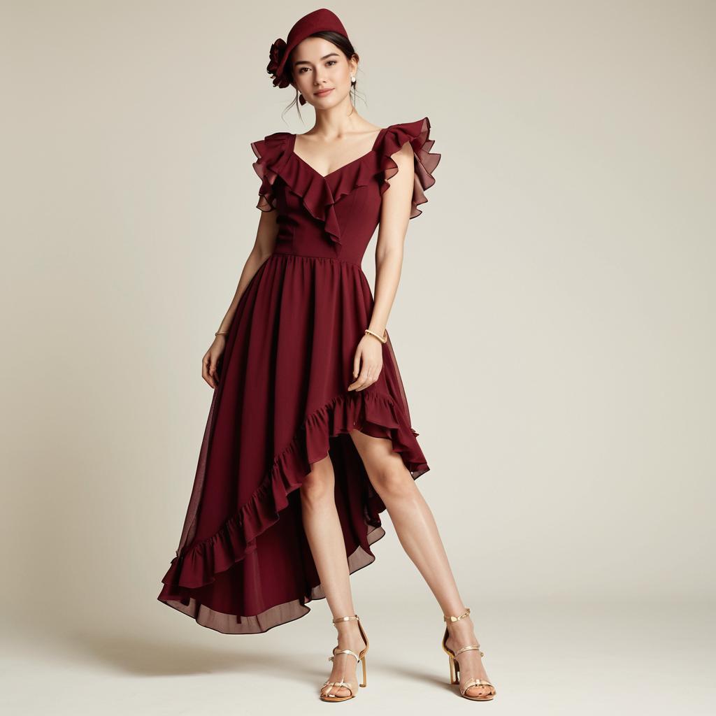 Woman, romantic modern, asymmetrical ruffle dress in burgundy, square neckline, ruffle cap sleeves, ruffled diagonal detail across the bodice, high-low hem with ruffle trim, sheer panel extending into a train, strappy stiletto sandals, delicate gold bangle, neutral studio background.