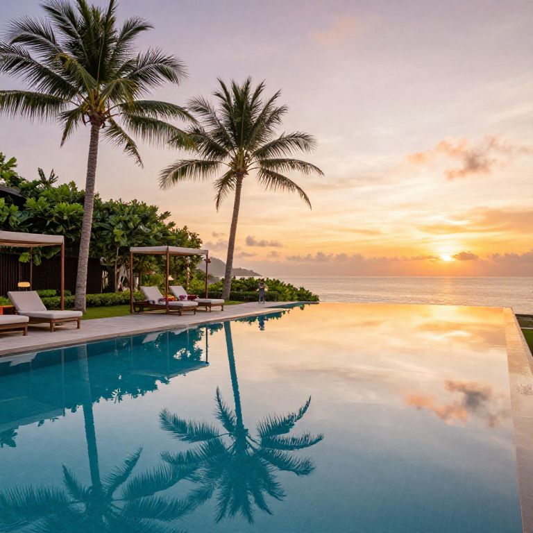 Upscale tropical resort infinity pool at sunrise, crystal clear water reflecting palm trees and vibrant sky, luxurious lounge chairs and cabanas, lush greenery surrounding, photorealistic, warm natural lighting, serene atmosphere