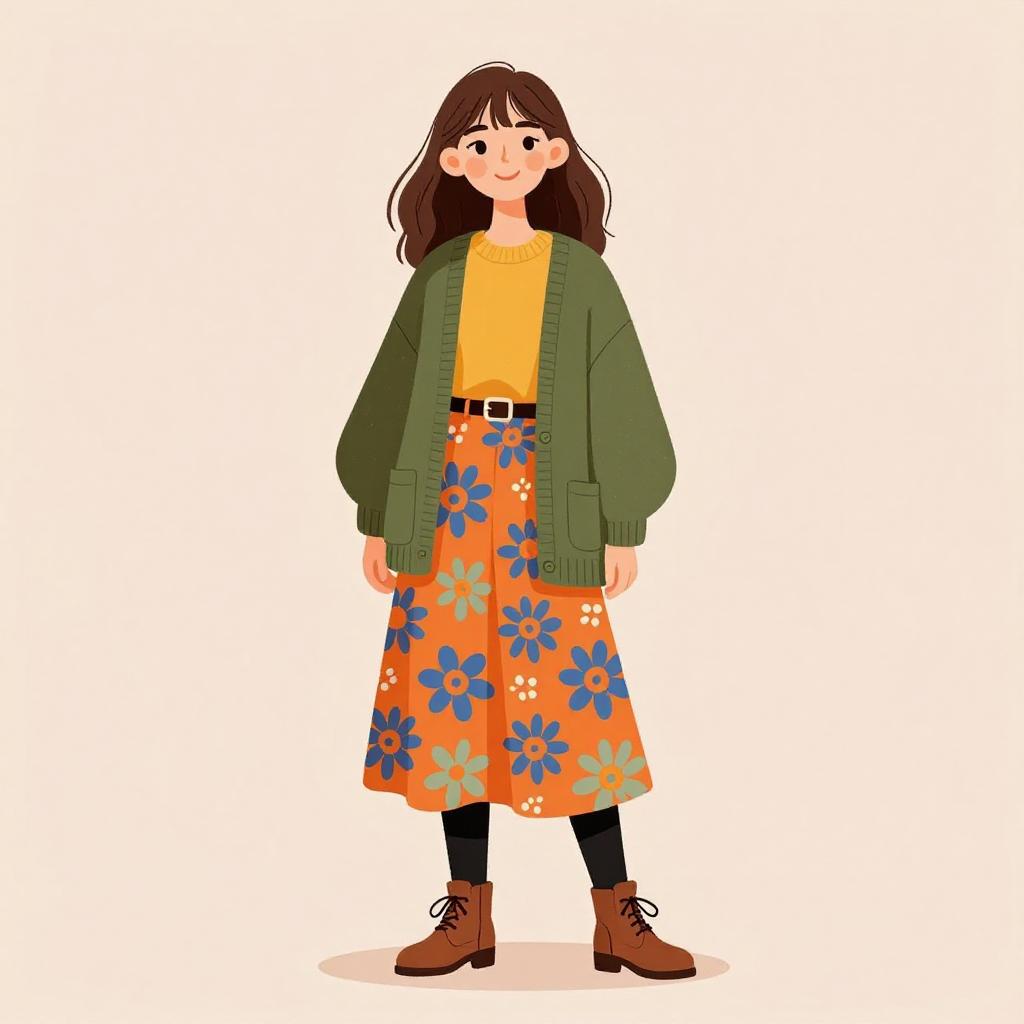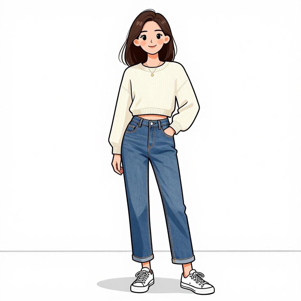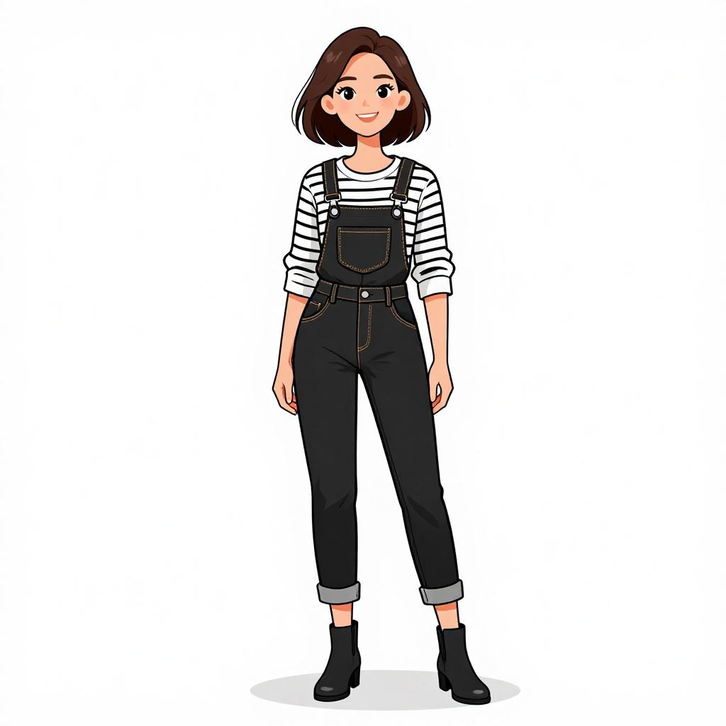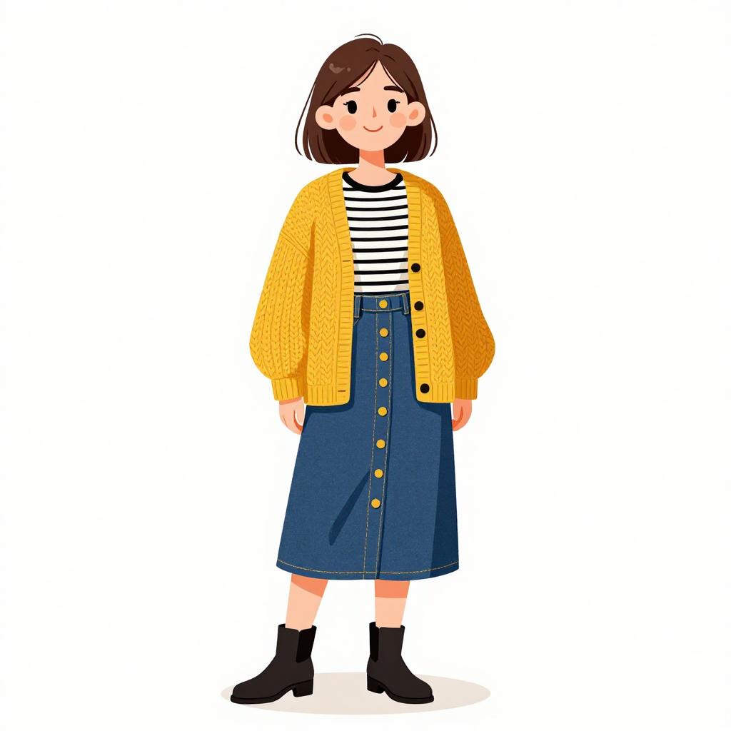 Woman with pretty face and pretty hair. smiling Woman, casual preppy, mustard yellow chunky knit cardigan, black and white striped fitted t-shirt, dark blue denim a-line skirt with central row of buttons, black ankle boots with a moderate heel, simple hairstyle with parted bangs, white background with light shadowing on the floor indicating studio lighting. --sref 1467