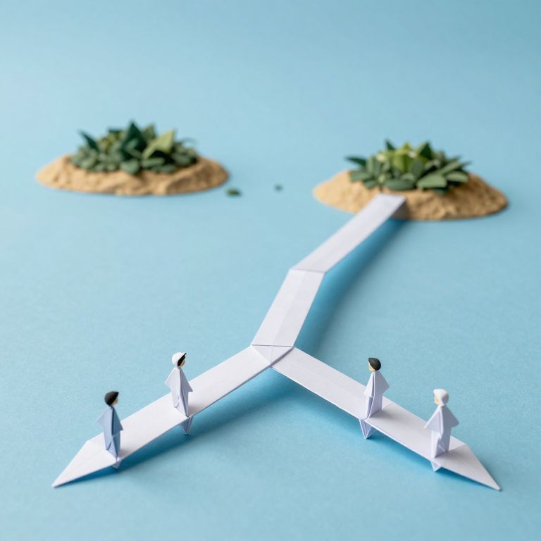 A bridge built from folding origami paper connects two uninhabited islands, changing its shape and meaning depending on the emotion of those who cross it.
