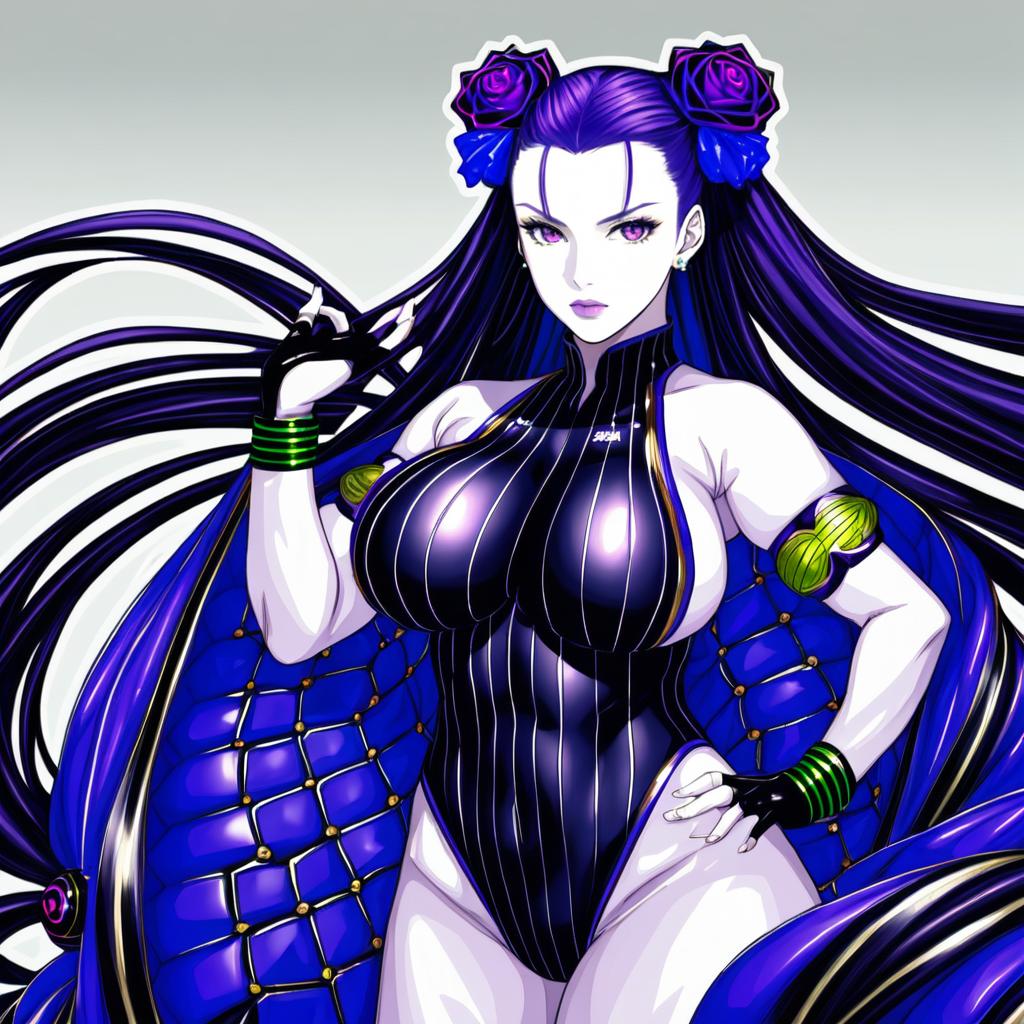 Murasaki shikibu (swimsuit rider) (first ascension) (fate), fate/grand order, 1girl, purple eyes, long hair, purple hair, tied hair, black hair, hair flower, large breasts, thighs, covered navel, black one-piece swimsuit, highleg swimsuit, half gloves, fingerless gloves, black gloves, bare shoulders, gold trim, armlet, shawl, by artist masami chie, anime