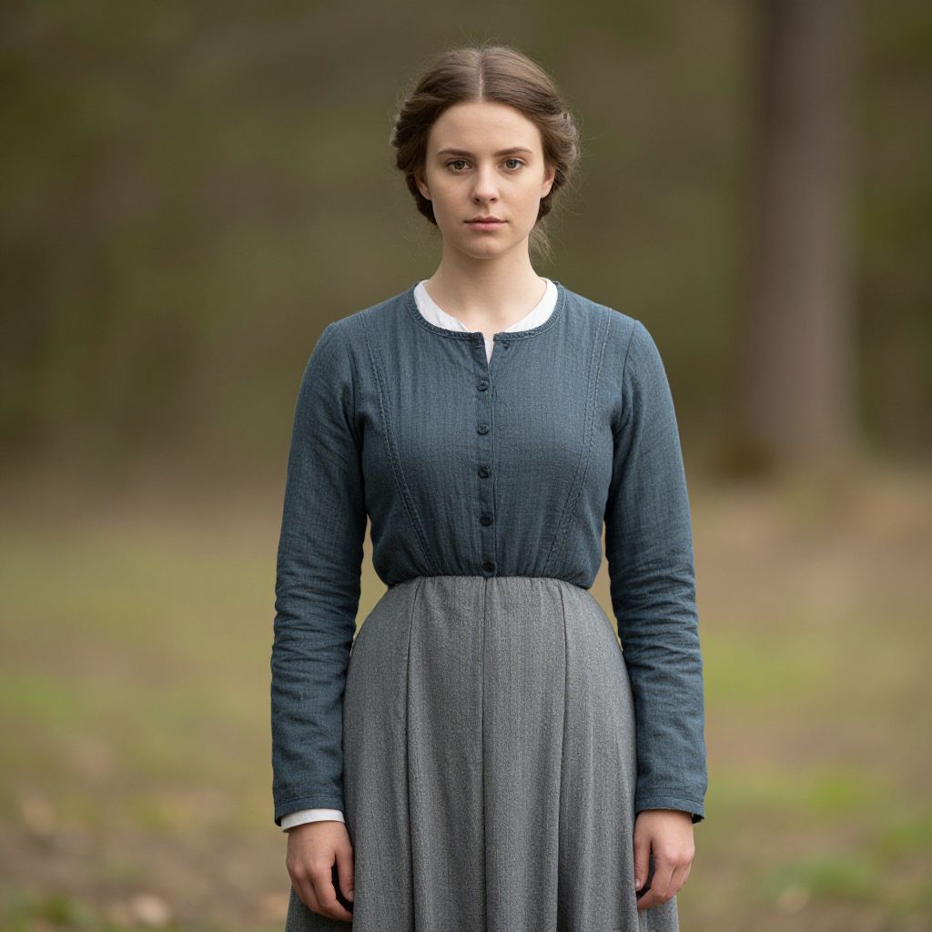 Photograph of a young white woman standing in a forest. She has fair skin, brown eyes, and brown hair styled in a simple updo. She wears a dark blue, long-sleeved, button-up dress with a white collar and a gray, pleated skirt. The background is blurred, showing tall trees and greenery. Her expression is serious and slightly somber. The lighting is natural, and the overall tone of the image is muted and earthy. The style is realistic, with a focus on simplicity and natural beauty. The image has a cinematic quality, suggesting it could be from a period drama film.