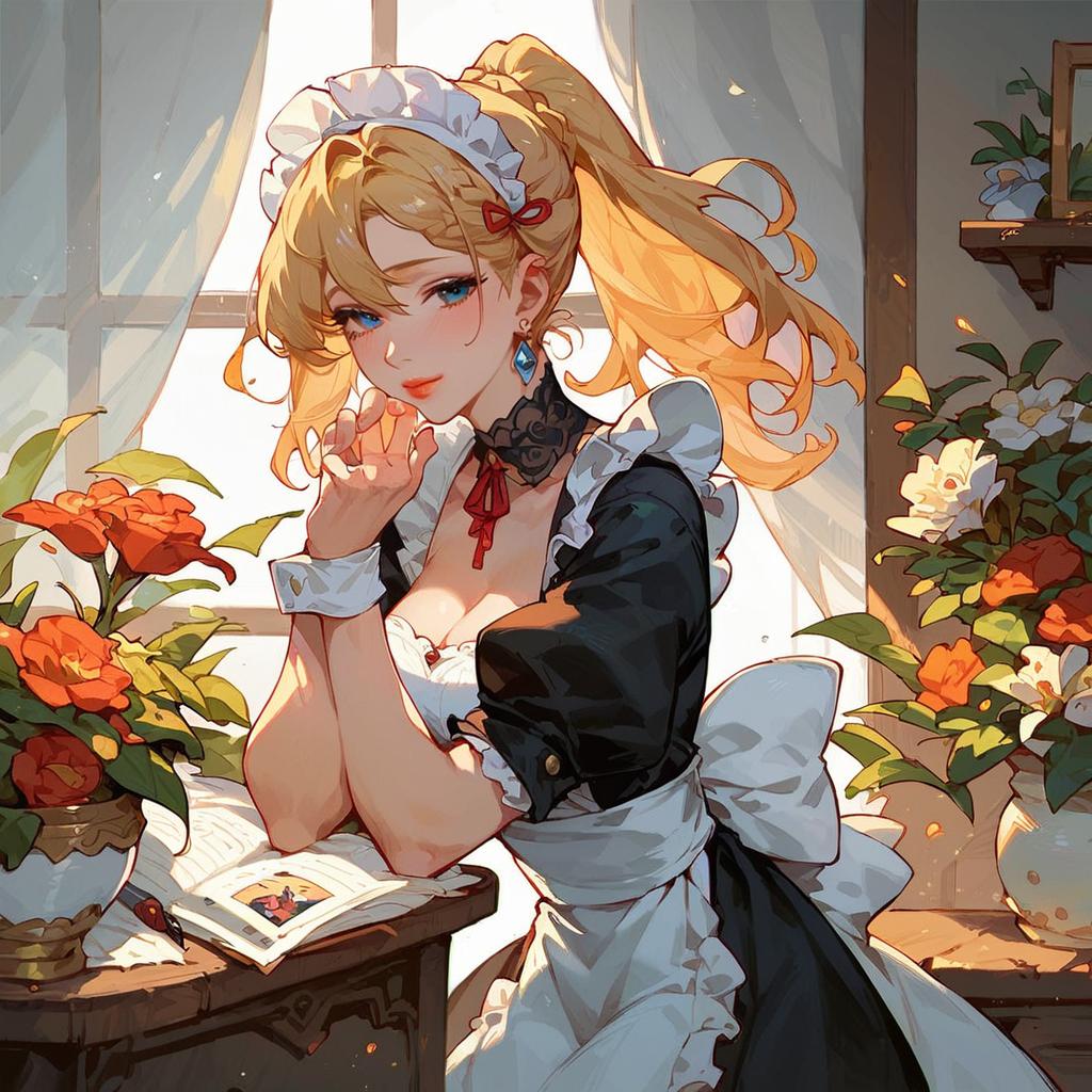 Anime Maid Serving Coffee with Flower Hair Ornament