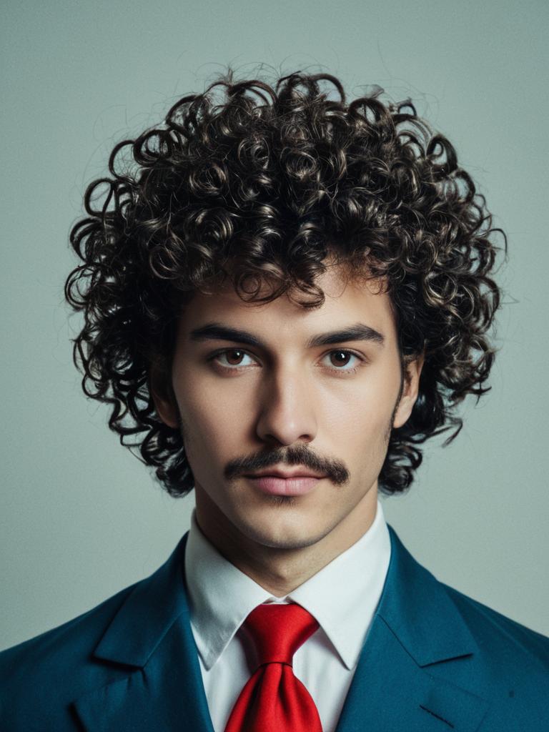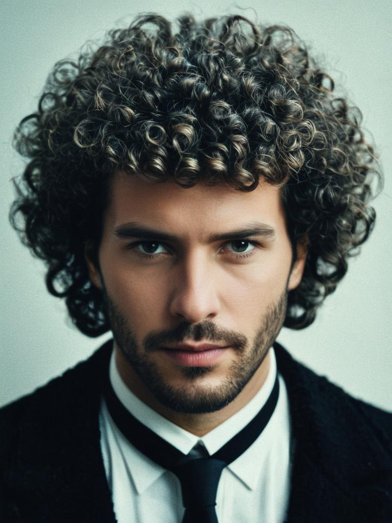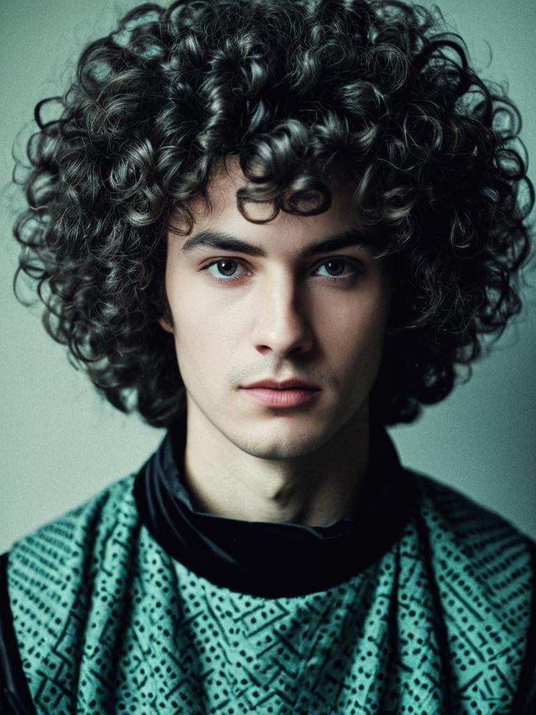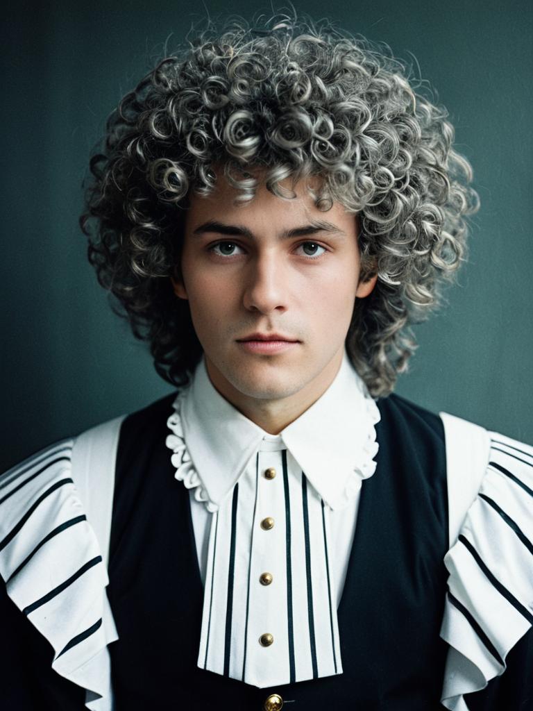 Man in Perm Hairstyle costume, cosplay editorial portrait, photorealistic tones