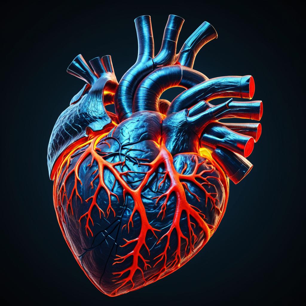 3D rendering, side shot of a complex system with hyper-detailed anatomical human heart, featuring ember capillary accents, anatomically correct, super-resolution with refractive and electrical highlights, inspired by Tetrahedron, hard lighting, ultra-realistic