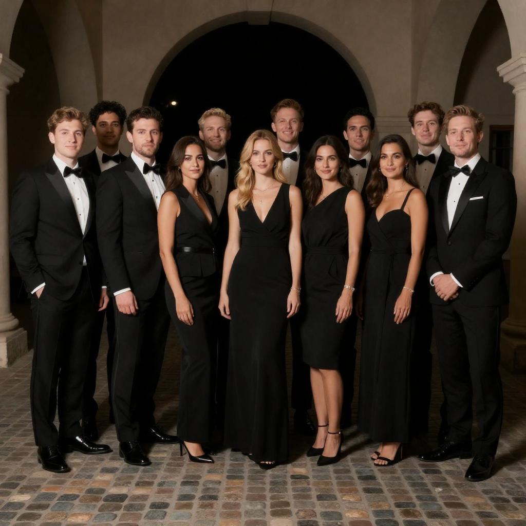Group photograph of eleven people. Seven men in black tuxedos, four women in formal attire. Dark background, dim lighting. Men stand on left and right, women in center. Smiling faces. Cobblestone ground. Arched structure in background.