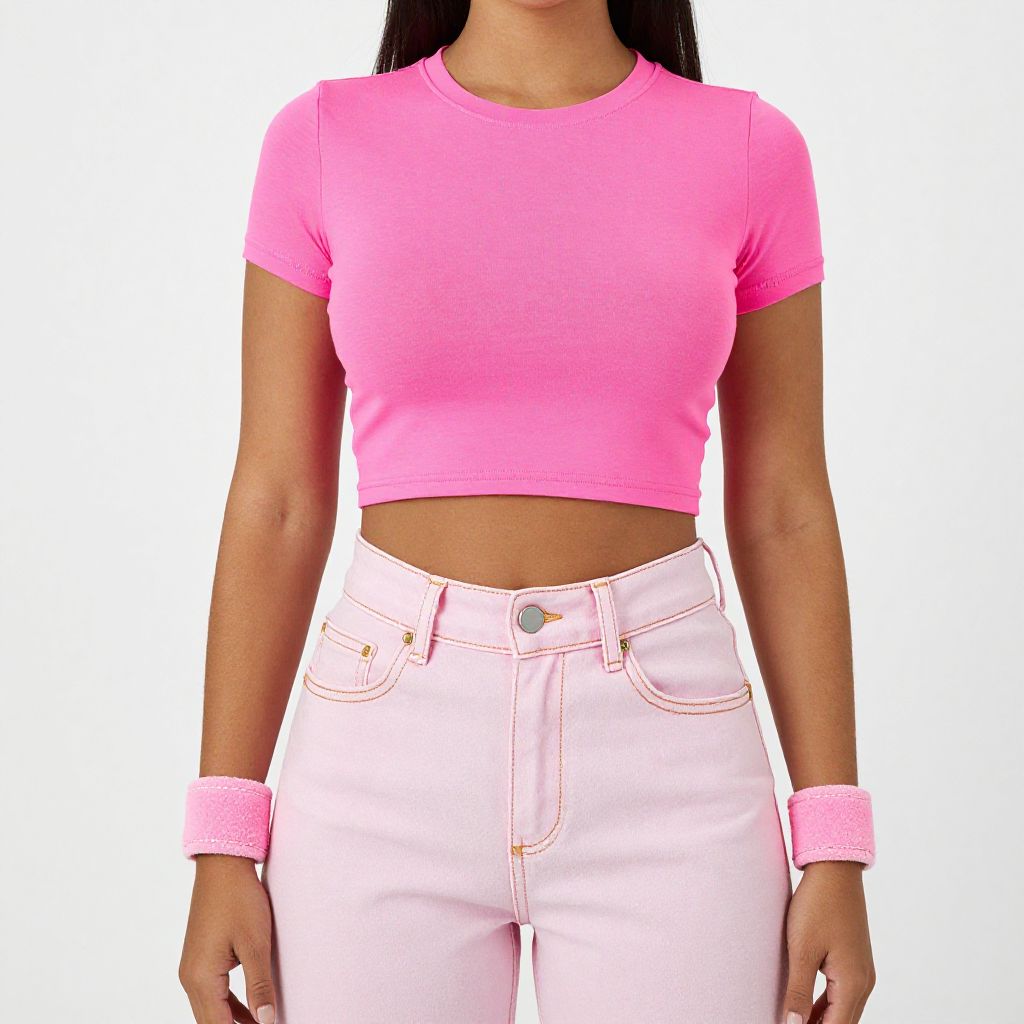 "Woman, casual streetwear, cropped fitted t-shirt in neon pink, short sleeves, crew neck, high-waisted jeans in pastel pink, acid wash, straight-leg cut, silver button closure, contrasting tan stitching, basic wristbands, white background.. Sexy. Pretty face and beаutiful eyes. Big breasts."