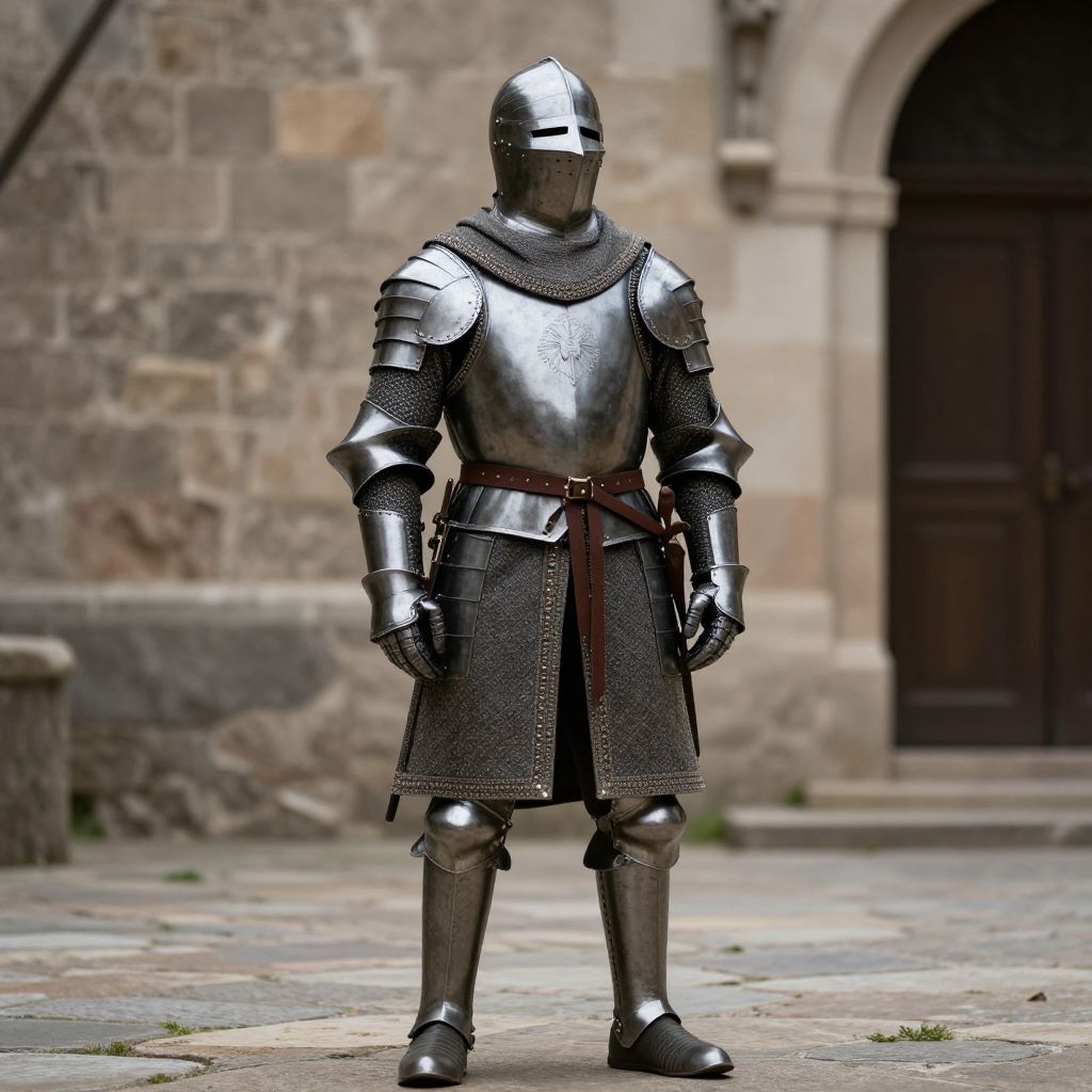 Photograph of a medieval knight in full silver armor, including helmet, standing in a stone courtyard with a wooden door in the background.