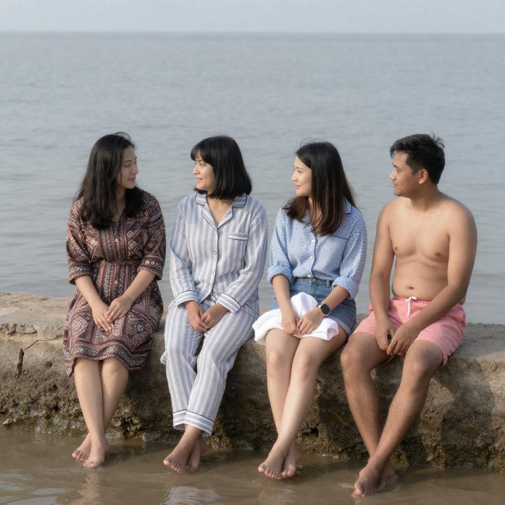 Four people sitting on a stone ledge by a water's edge. Three women, one man. Casual clothing, barefoot. Woman on left in brown patterned dress. Middle woman in striped pajamas. Right woman in blue checkered shirt, denim shorts, holding white towel. Man in pink shorts. Stone ledge, muddy water, legs in water. Casual, relaxed setting.