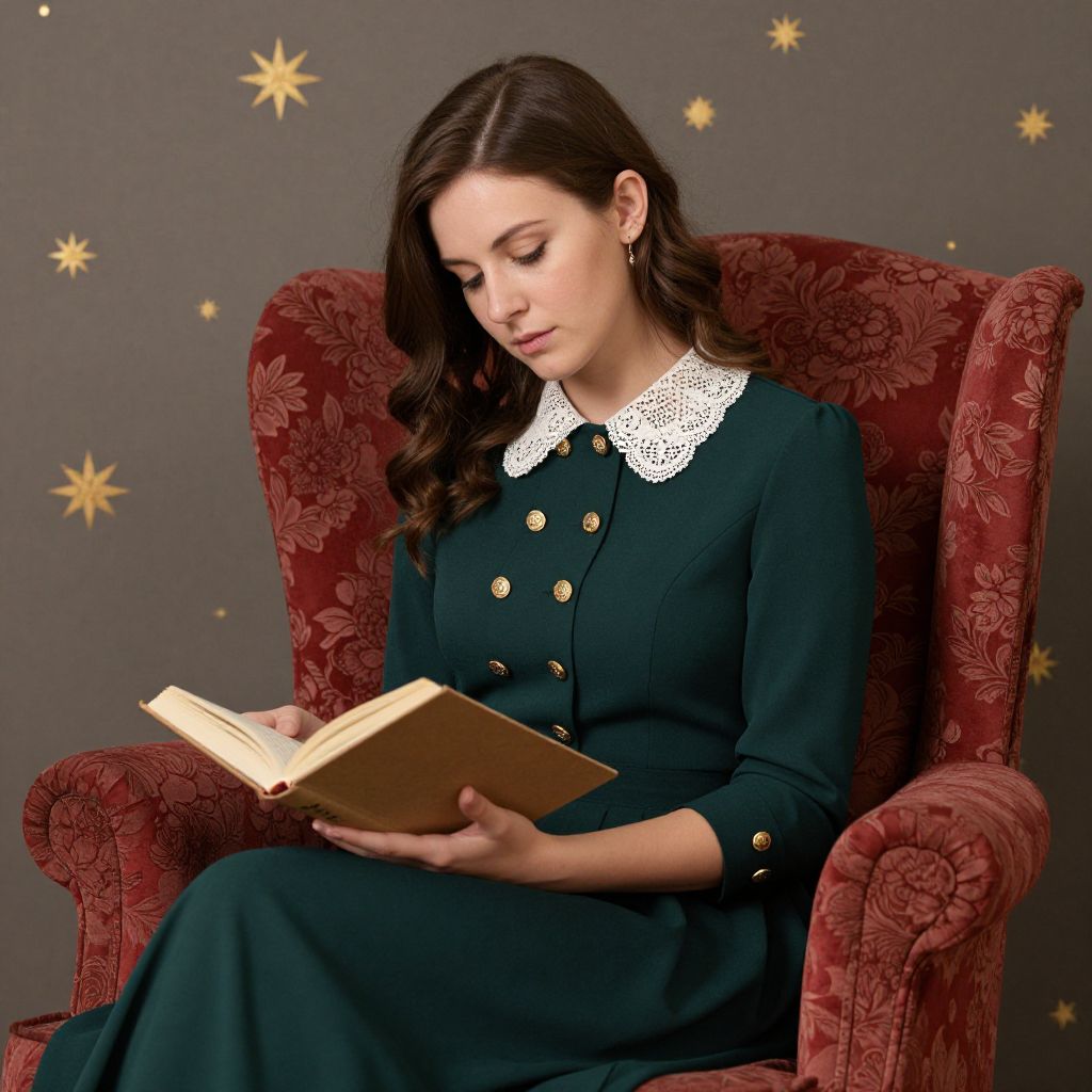 Photograph of a young Caucasian woman with fair skin and long, wavy brown hair, sitting in a plush, red, floral-patterned armchair. She wears a dark green, button-up dress with a white, lace Peter Pan collar and gold buttons. She is reading a beige, hardcover book, looking down with a calm expression. The background is a solid gray with scattered, golden star patterns. The lighting is soft, highlighting her serene demeanor and the texture of her dress and chair. The overall style is vintage, evoking a nostalgic, cozy atmosphere.