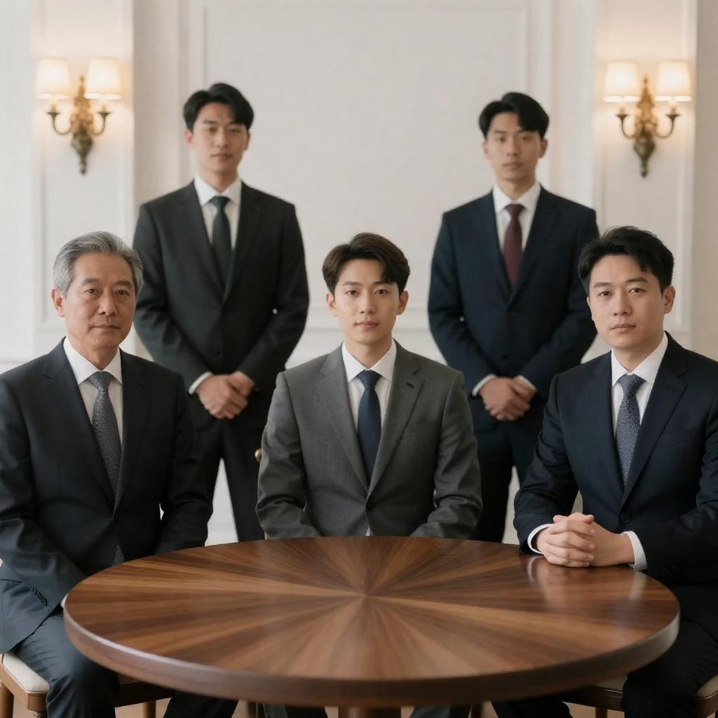 Photograph of five men in formal suits seated around a wooden table in a well-lit, elegant room with white walls and sconces. Three men are in the foreground, two standing in the background. The central man in a gray suit looks forward, while the man on the right clasps his hands.