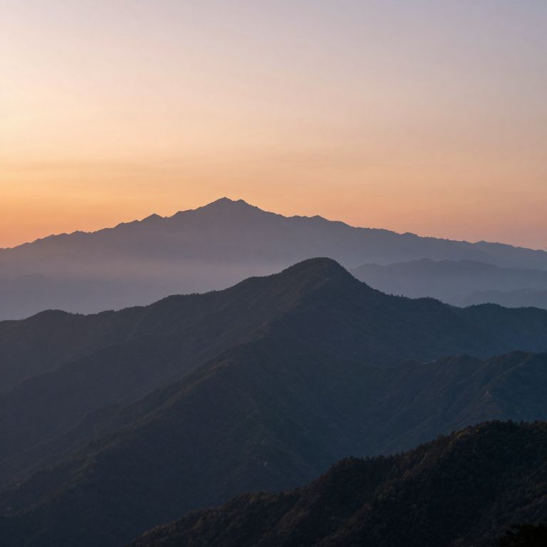 Photograph of a mountain range at sunrise. The foreground features dark, shadowed peaks with dense, tree-covered slopes. Midground shows lighter, more subdued mountains, creating a layered effect. The background displays a prominent, silhouetted mountain peak against a gradient sky transitioning from soft pink and orange hues near the horizon to pale blue higher up. The image captures the serene, tranquil atmosphere of early morning light. The textures of the mountains contrast with the smooth gradient of the sky, emphasizing the depth and distance of the landscape.