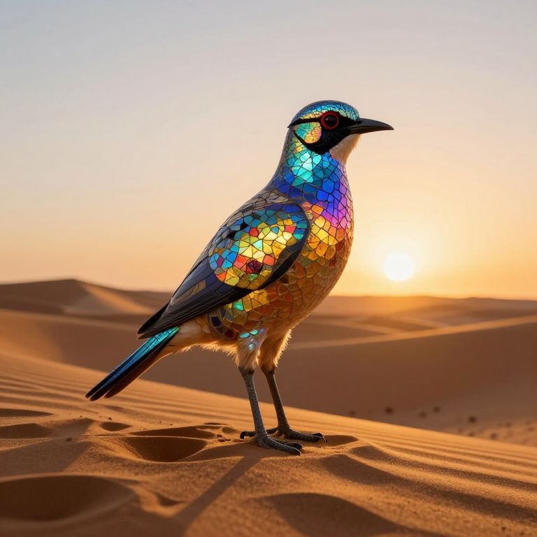 A radiant mosaic bird, its feathers shimmering with kaleidoscopic patterns, stands poised atop a golden sand dune as the sun sets, casting an otherworldly glow over the surreal desert landscape.