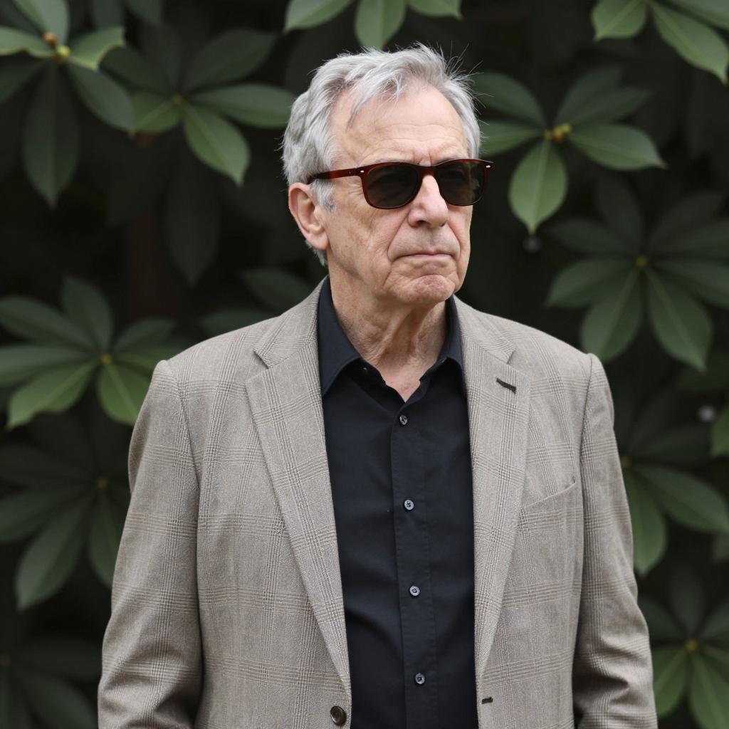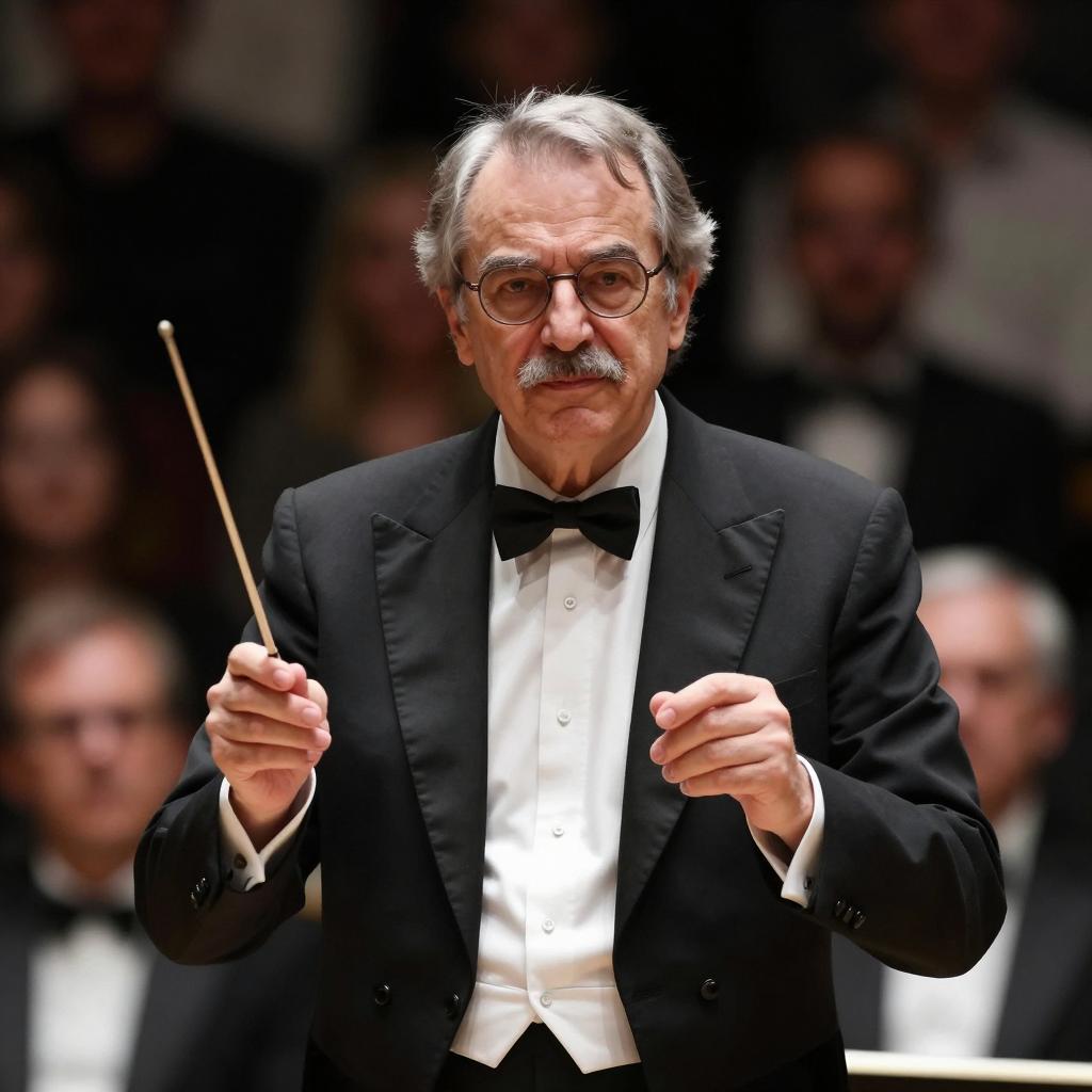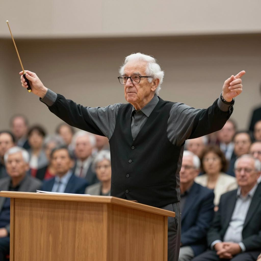 Old man with white hair, glasses, gray shirt, black vest, and black sleeves, standing with arms outstretched, holding a conductor's baton in each hand. Large audience in background. Wooden podium in front. Blurred faces in audience.