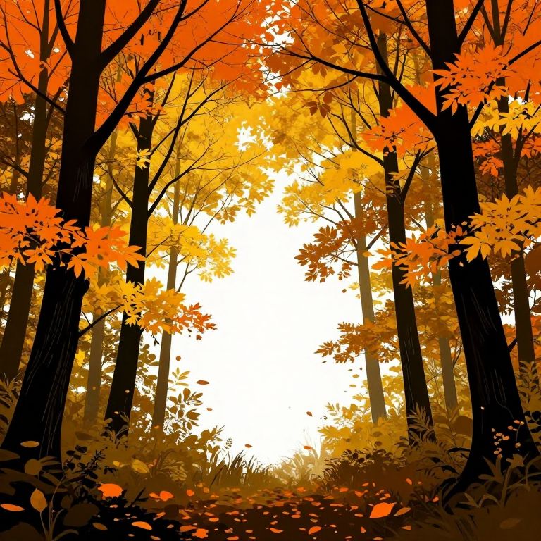 This digital illustration depicts a vibrant autumn forest scene. Tall, dark brown trees with thick trunks stand vertically, their branches adorned with bright orange and yellow leaves. The leaves create a canopy overhead, with the sunlight filtering through, illuminating the white sky at the center. The forest floor is covered in fallen leaves and small plants, adding texture and depth. The contrasting colors of the dark trees and bright leaves create a striking visual effect, emphasizing the beauty of the autumn season. The style is crisp and detailed, with a focus on natural elements and warm, autumnal hues.