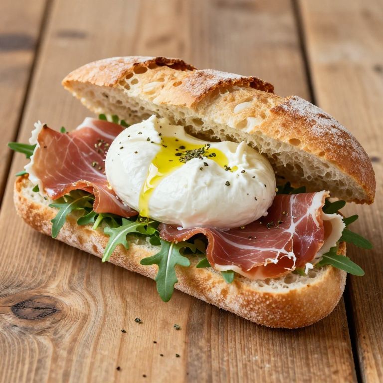 Panuozzo, crispy and fluffy Italian bread sandwich sliced open, filled with layers of prosciutto, fresh arugula, creamy burrata cheese, drizzled with olive oil, Mediterranean herbs, served on rustic wooden table, natural lighting.
