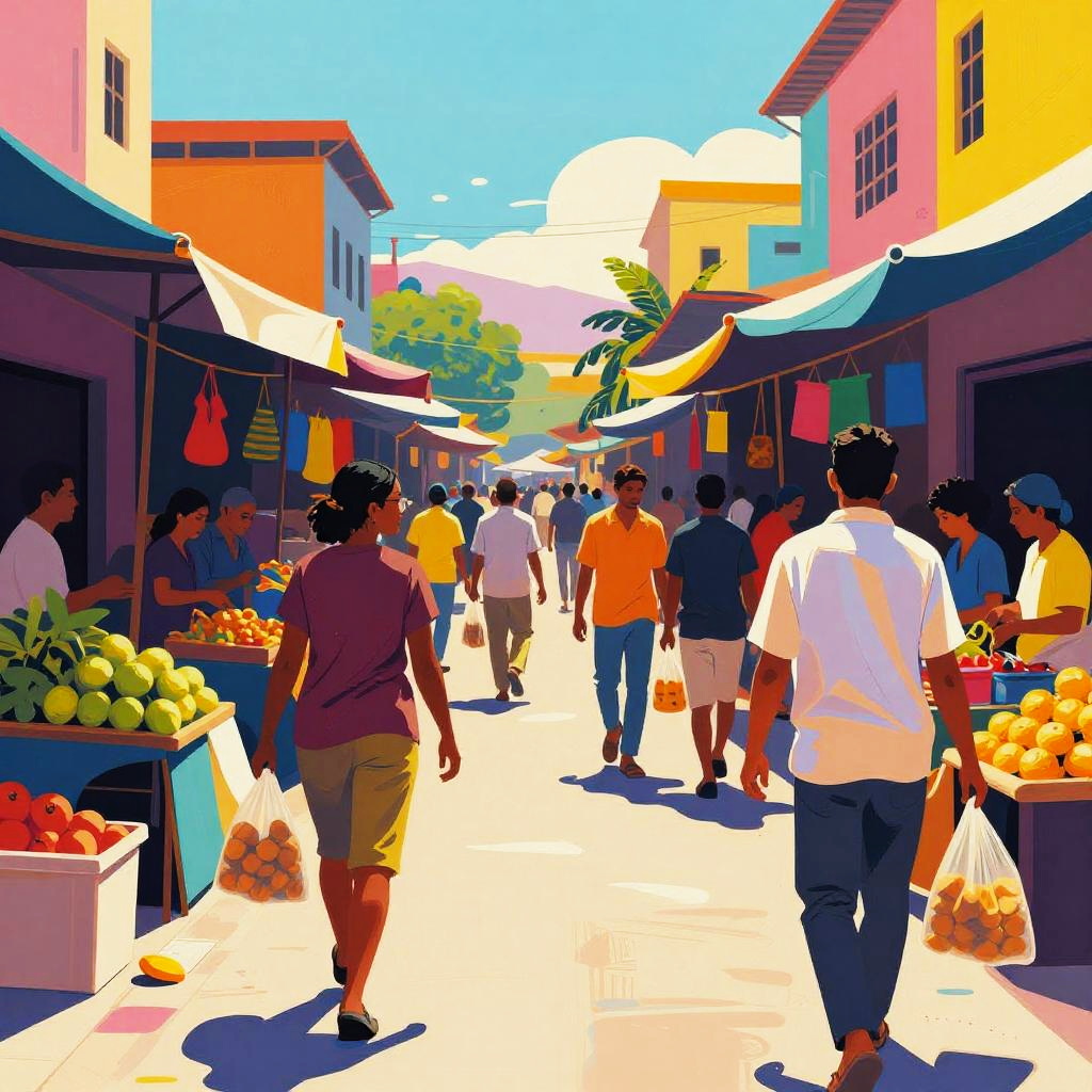 AI photo filter transforming a bustling market scene into a vibrant, pop-art-inspired composition with exaggerated colors and stylized textures, highlighting dynamic movement and cultural diversity through abstract shapes and bold digital brushwork.