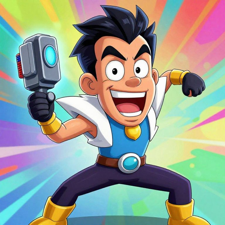 This is a vibrant, digital cartoon illustration of a confident, dark-haired, young male character with large, expressive eyes and a wide smile. He is holding a futuristic, glowing hammer in his right hand, raised in a triumphant pose. He wears a white sleeveless vest over a blue shirt, black pants, yellow wristbands, and gold boots. A blue, circular belt buckle matches the glowing hammer. The background features a radiant, multicolored burst of light with hues of yellow, pink, blue, and green. The character's exaggerated, animated style and dynamic pose convey energy and determination.