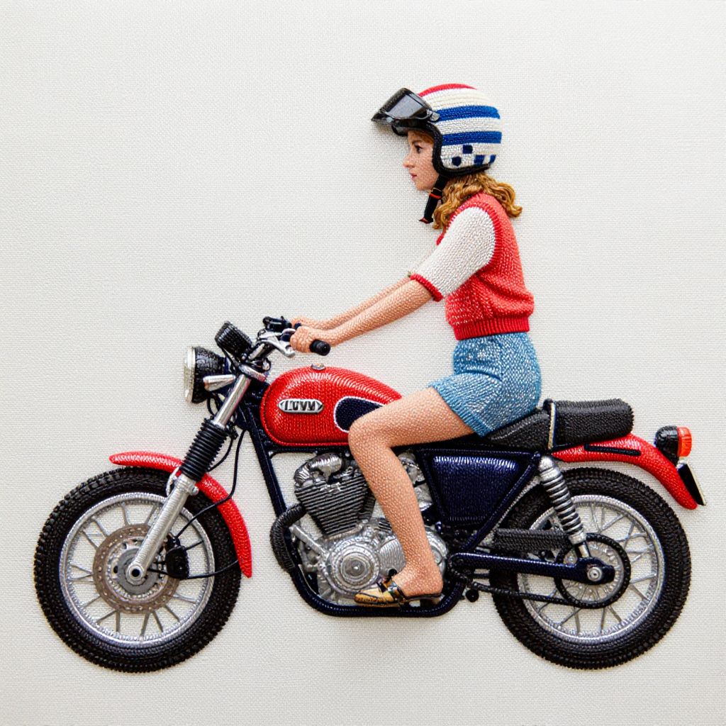 Embroidery Shading very realistic fashion editorial by wes anderson, inspired in motorcycles, the helmet is made with knitted fabrics woman using it very fashion Kodak portra 800, 35mm style,