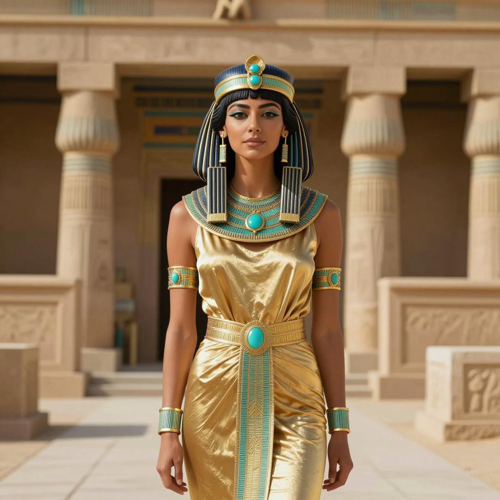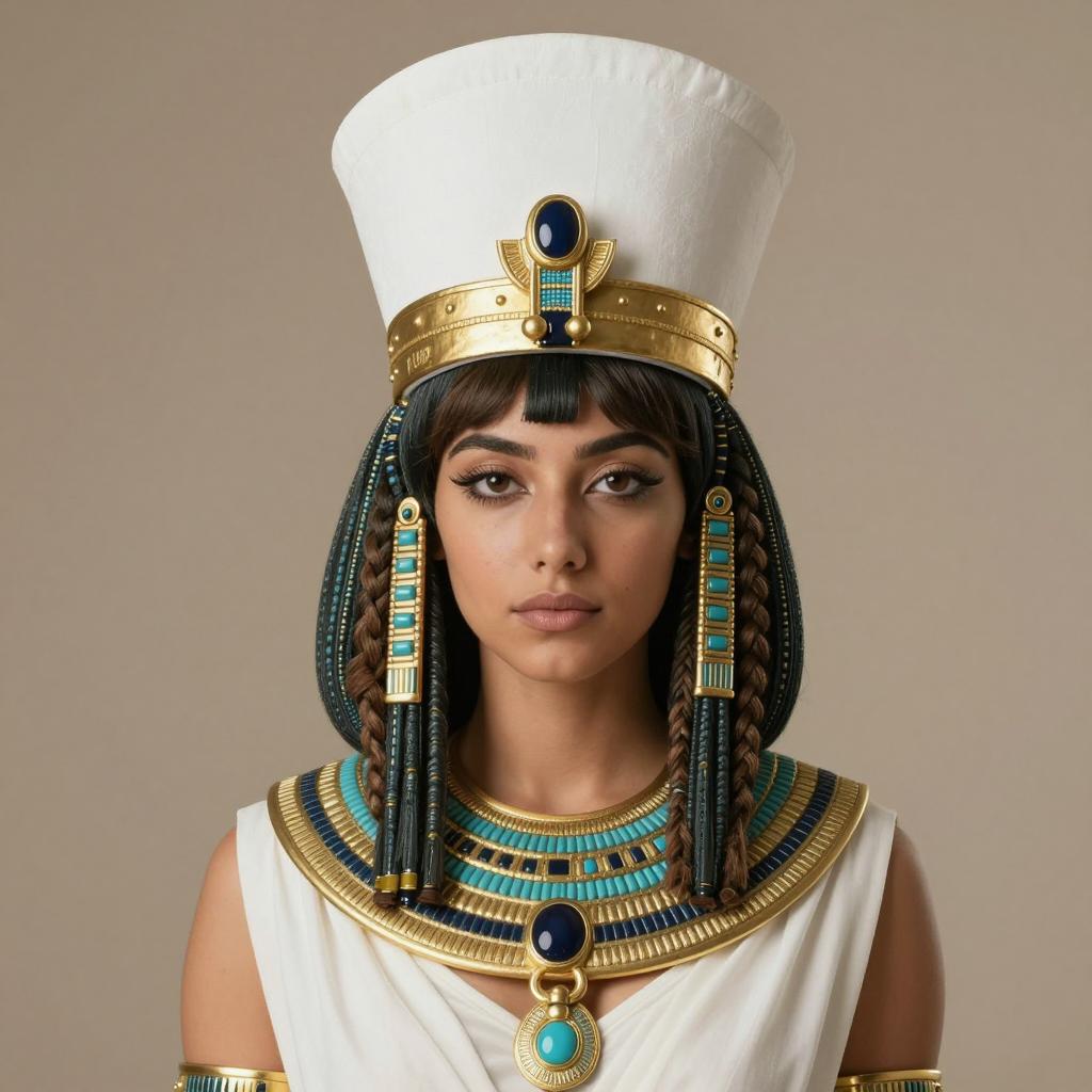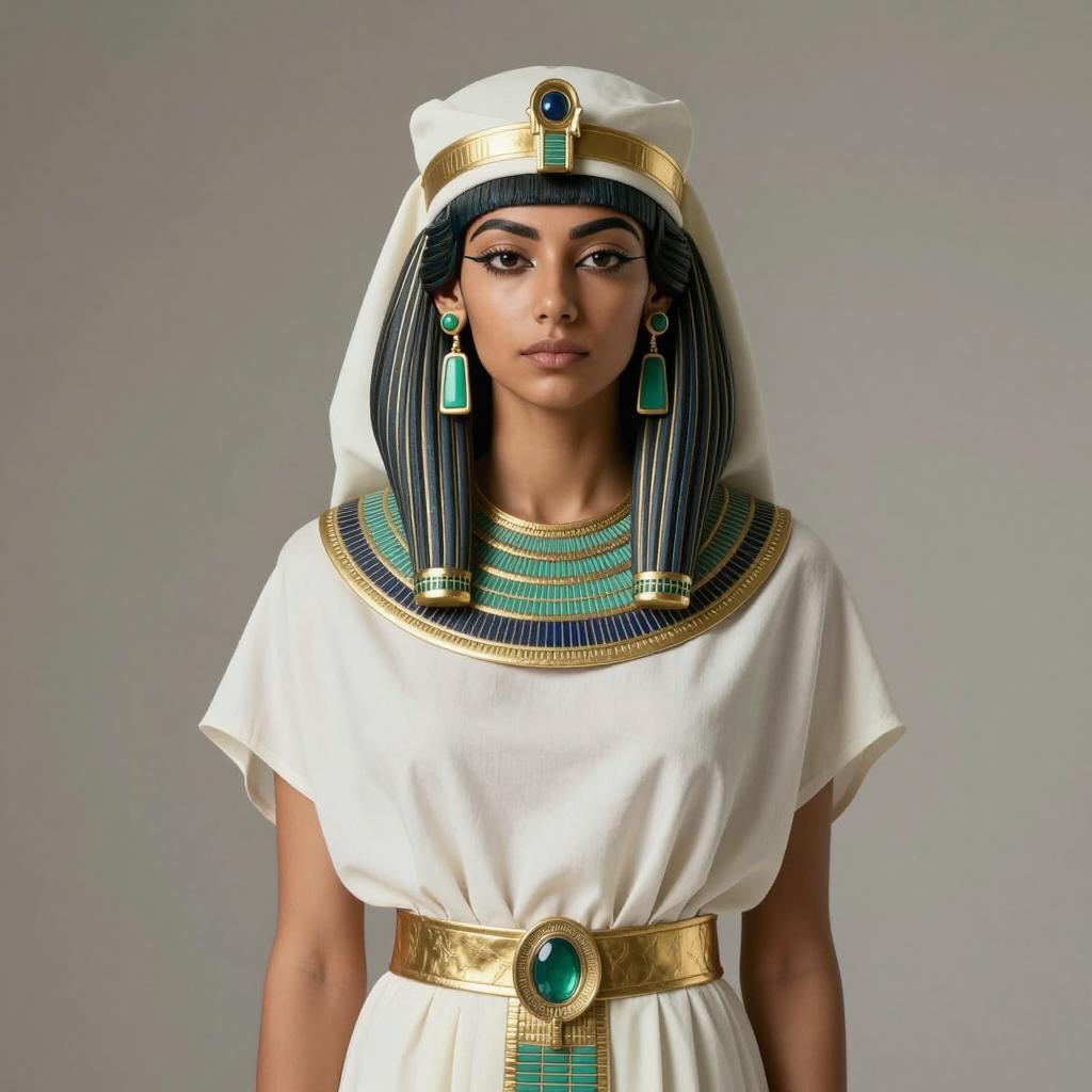 Egyptian dress female, photorealistic portrait of a young woman with olive skin, dark brown eyes, and long braided brown hair, wearing an ancient Greek-inspired outfit with a white draped robe and gold trimmed edges, ornate gold headpiece with a central feather design, black beaded necklace, large gold hoop earrings, serious expression, soft sunlight, blurred background of a classical stone building with arches and potted plants, realistic ure and lighting, highly detailed, standing in front of a wall, warm colors, Mediterranean or classical historical setting