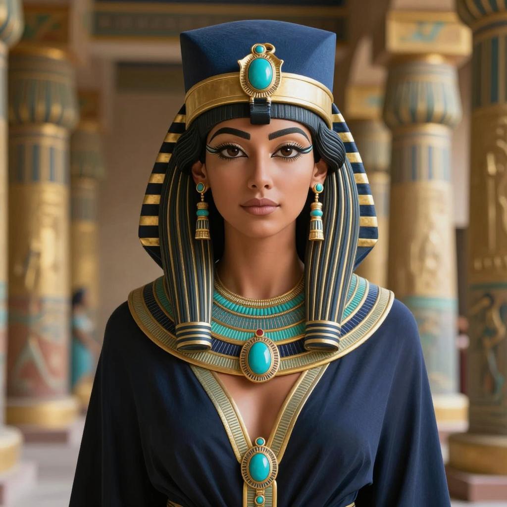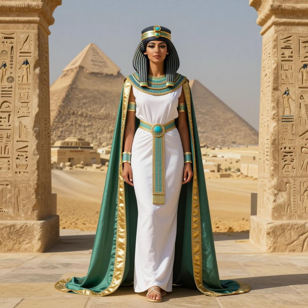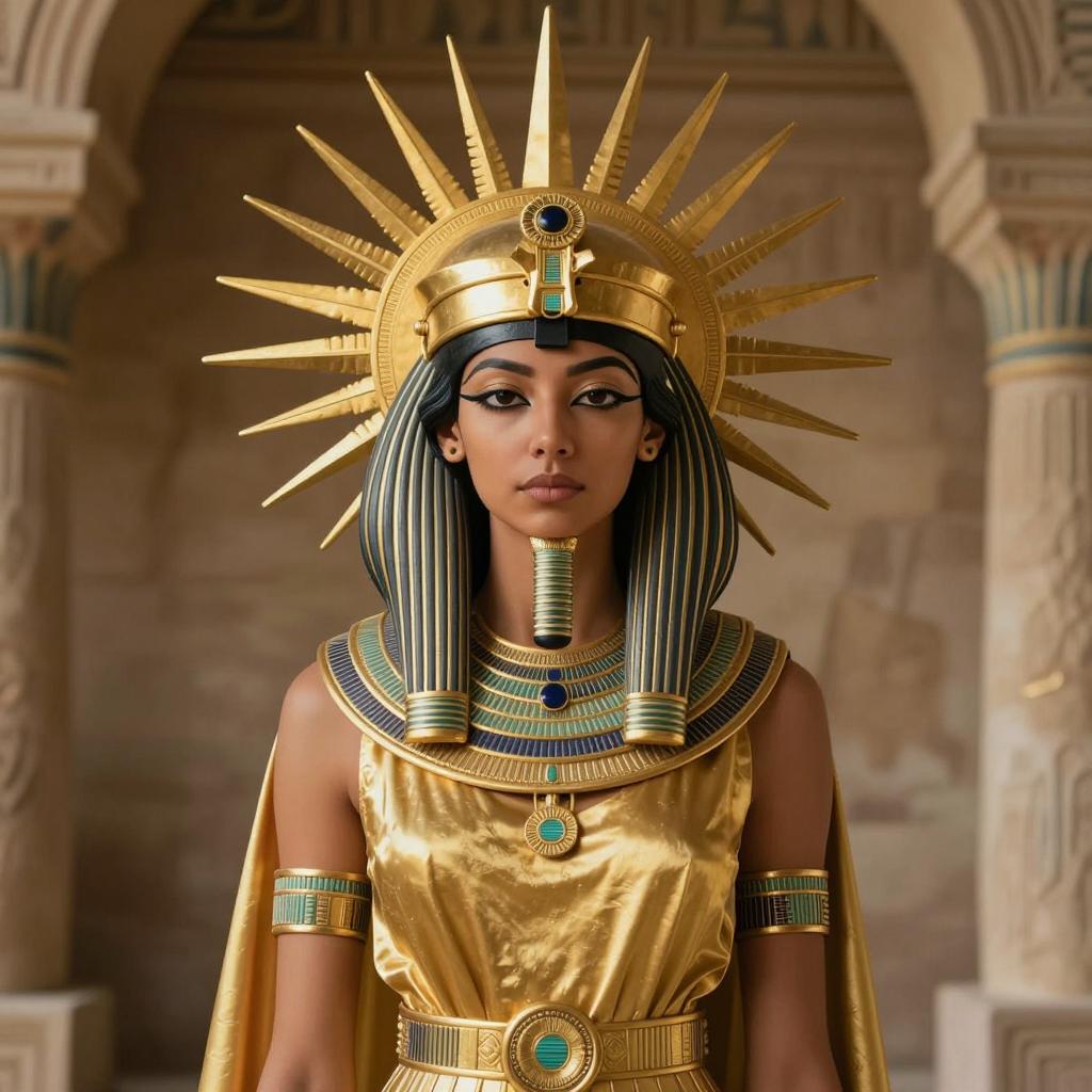Egyptian dress female, photorealistic portrait of a young woman with olive skin, dark brown eyes, and long braided brown hair, wearing an ancient Greek-inspired outfit with a white draped robe and gold trimmed edges, ornate gold headpiece with a central feather design, black beaded necklace, large gold hoop earrings, serious expression, soft sunlight, blurred background of a classical stone building with arches and potted plants, realistic ure and lighting, highly detailed, standing in front of a wall, warm colors, Mediterranean or classical historical setting